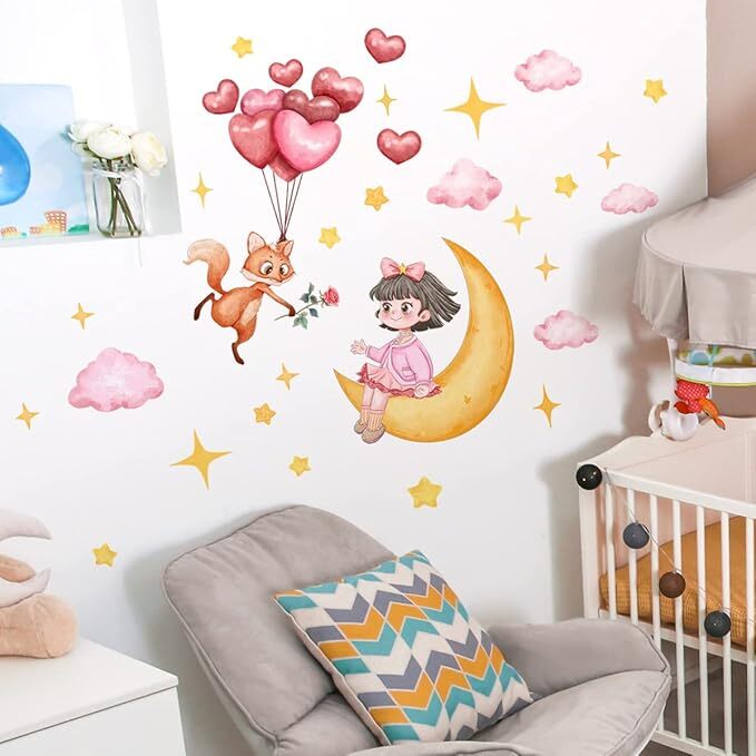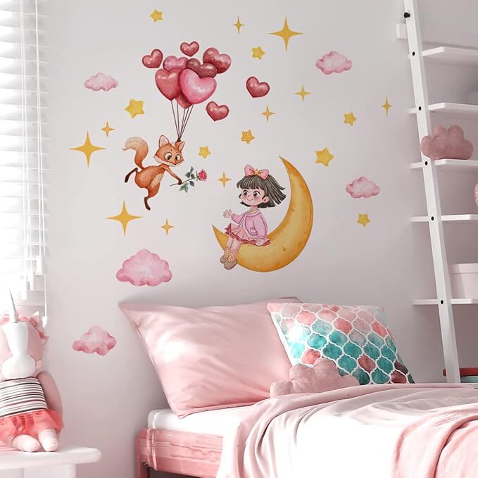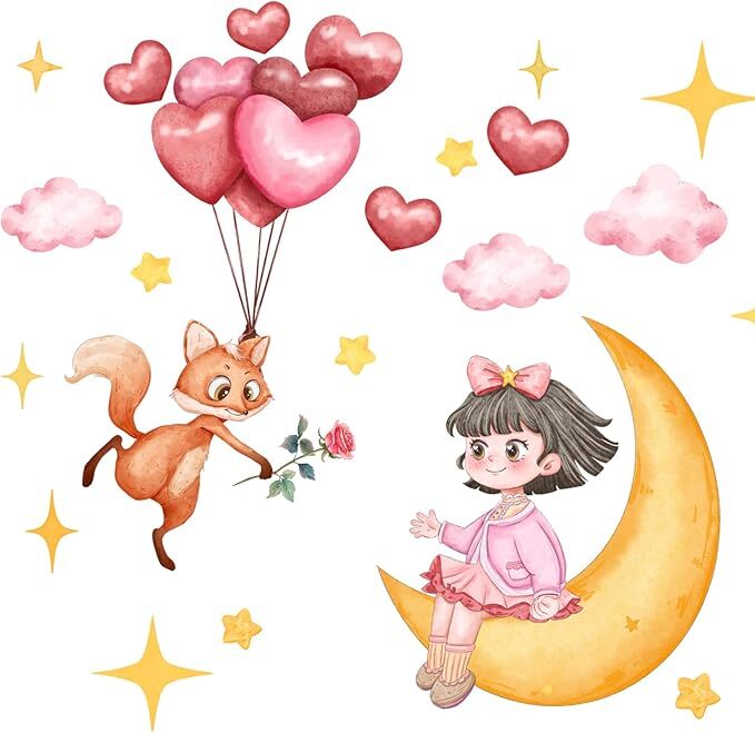 壁紙 デコ ウォールステッカー 赤いハートの風船 きつね リボンの女の子 空の雲 インテリア ポスター ステッカー シール式ステッカー