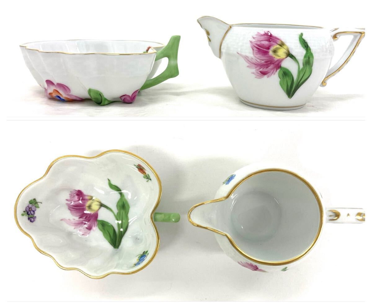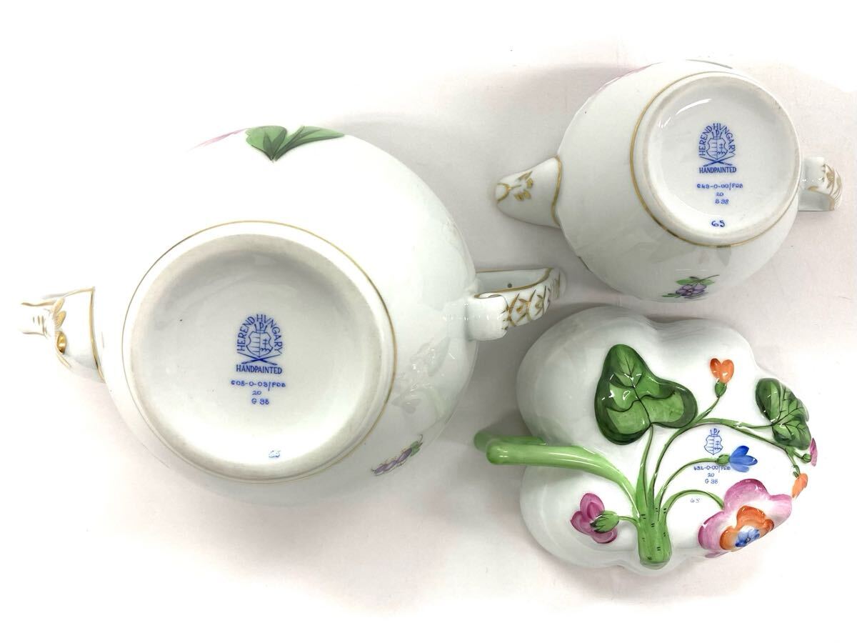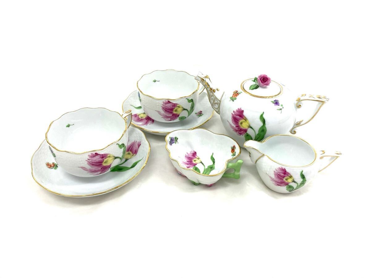 T10/091 HEREND HVNGARY ヘレンド ハンガリー ティーポット カップ ソーサー 他 花柄 ティータイムセット 7点 G98 ホワイト