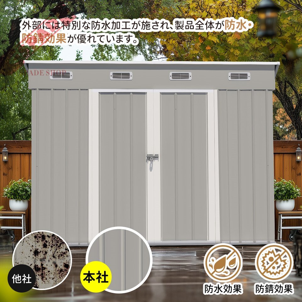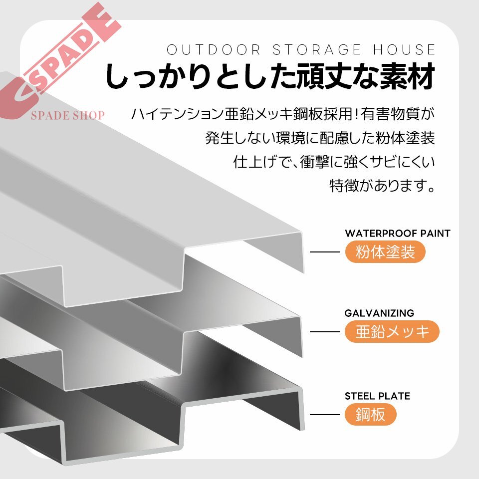 ◆01マルチに活躍! 置き場に困るものはまとめて収納 マルチに活躍する収納庫。家の周りで散乱しがちな荷物をすっきり! ゴミによるのカラスや猫のイタズラ対策にも最適です。 レジャー用品 ガーデンニング用品 掃除道具 資源ゴミ 子供用のプール、釣り具 自転車(自行):自転車や電動自転車の駐輪に適した広々としたエリアを提供。簡単に駐輪でき、必要なスペースを確保できます。 自転車用駐輪エリア:約2.667㎡ ◆02超大型収納スペースで圧倒的な収納力 4827Lの超大型収納スペースを提供し、庭や室内で場所を取る物品をきちんと片付けられます。 大型のガーデンツールや季節物の衣類、大きなスポーツ用品などをすべて一括収納。収納力が圧倒的だから、どんな物でも収めることができます。 ◆03扉の開閉が邪魔にならない!観音扉タイプ 観音扉タイプの扉は最大180度まで開くことができます。扉が全開にできるタイプなので、大きなサイズの倉庫でも内容物が一目で見やすく、取り出しやすくなります。 大きく開けられるため、荷物の出し入れが簡単です! ◆04施錠・解錠できる便利な機能 ロックピンは、下のボタンを上に押し上げることでロックされ、上のボタンを押すと縮んでロックが解除される仕組みになっています。使いやすく、スムーズに施錠・解錠ができる便利な機能です。 ◆05床材補強フレーム付き! スチール補強フレーム付きで、安全性・耐久性を向上させました! ※床材は付属しておりません。お客様にてご準備をお願いいたします。 ◆064段階調節 棚板が4段階調節を採用しており、1回の調節で28.6cmごとに高さ変更が可能です。 お好みや使用状況に合わせて、高さを調整できるので、スペースを有効に使いながらも自由なレイアウトが可能です。 安心の耐荷重 各棚板約20kg(1枚あたり) ◆07しっかりとした頑丈な素材 ハイテンション亜鉛メッキ鋼板採用! 有害物質が発生しない環境に配慮した粉体塗装仕上げで、衝撃に強くサビにくい特徴があります。 外部には特別な防水加工が施され、製品全体が防水・防錆効果が優れています。 ◆08衝撃に強く凹凸壁面 壁面には特有の凹凸形状が採用されています。 通常商品の平滑な壁面と比較して、凹凸部分が外部からの衝撃や圧力を分散し、全体的により安定感が増しています。 ◆09排水に役立つ屋根 屋根は本体よりも広く、斜面が設けられています。 雨が降ると、屋根にたまることなく、斜面と凹槽を経由して地面に流れ落ちます。これにより、物置内に雨が侵入する心配がなく、内部の部品をより良く保護します。 ご注意:完全な防水仕様ではありませんので、事前に防水処理を行うことをお勧めします。 ◆10 6つの換気口が付き! 空気を循環させて、室内の温度と湿度を快適に保ちます。 ◆11屋根の耐荷重について 屋根の耐荷重は一般的に1平方メートルあたり30kg程度です。 通常の積雪には耐えられますが、積雪が多い場合は早めに雪かきを行ってください。積雪や台風などの自然災害による損害については、保証できませんのでご了承ください。積雪地域や台風の影響を受けやすい地域では、必要に応じて屋根の補強をお勧めします。 補強キットは当店では取り扱っておりませんので、お近くのホームセンターなどで補強材をご購入ください。 ◆12その他の安心対策 #1.プラスチック屋根カバー 収納庫の屋根を補強できます。