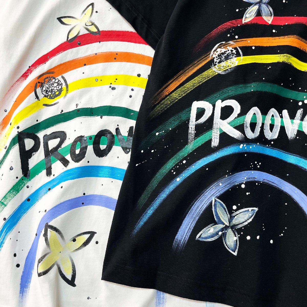 首回りは、どんなアイテムとも相性の良いクルーネックを採用。フロントはシンプルなデザインで清潔感があり、バックには大きなレインボーが施されています。一瞬で目を引くアートなデザインで、個性をしっかりアピール。