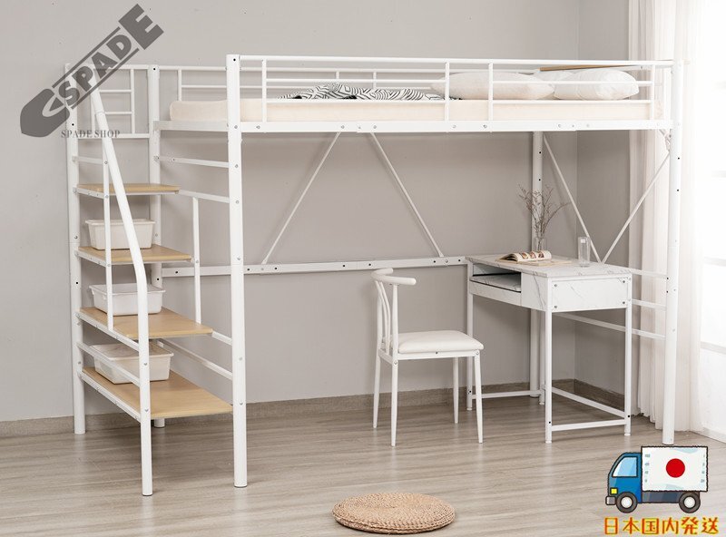 【国内発送】SD ロフトベッド 階段付き パイプベッドセミダブル コンセント付き 収納 スチール 耐震 ベッド シングル パイプベッド