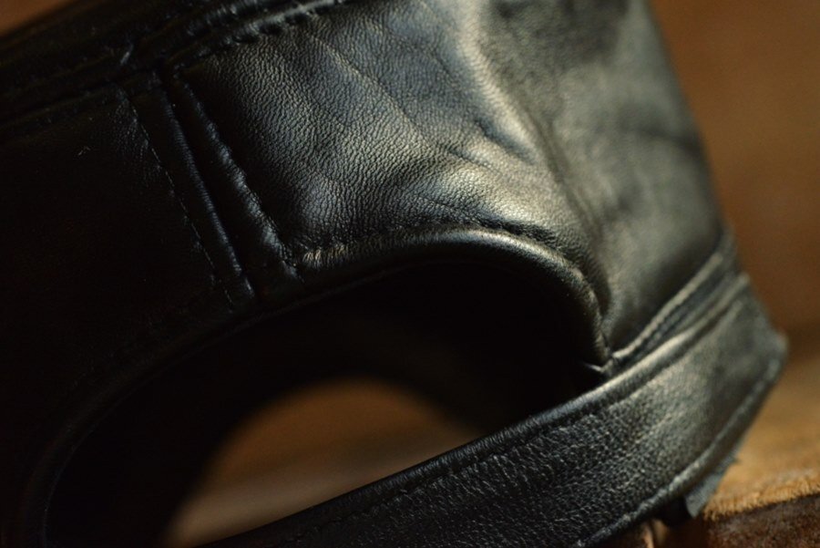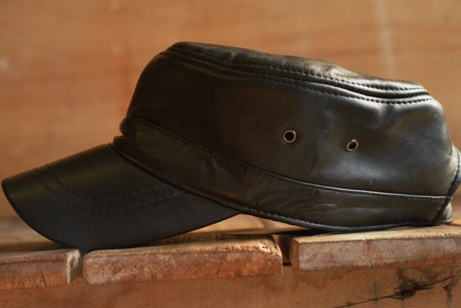 本革使用のレザーワークキャップ。ブラックのソリッドカラー。使い込めばさらに風合い豊かな質感に。大人のオシャレが楽しめる帽子!