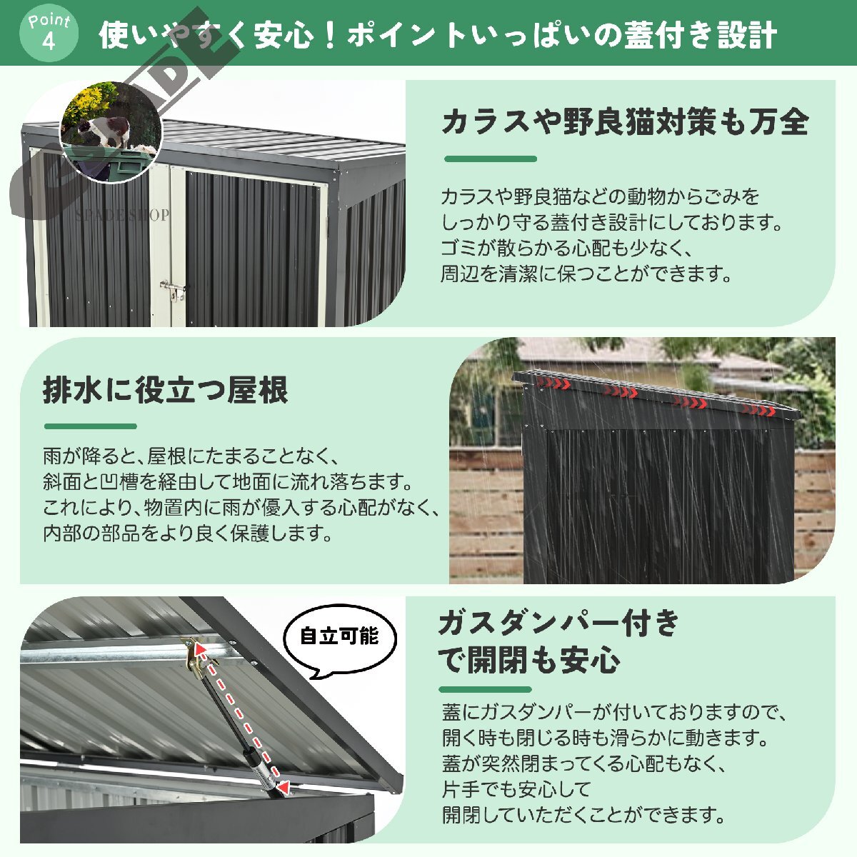 • ◎05【使いやすく安心!ポイントいっぱいの蓋付き設計】【カラスや野良猫対策も万全】カラスや野良猫などの動物からごみをしっかり守る蓋付き設計にしております。ゴミが散らかる心配も少なく、周辺を清潔に保つことができます。