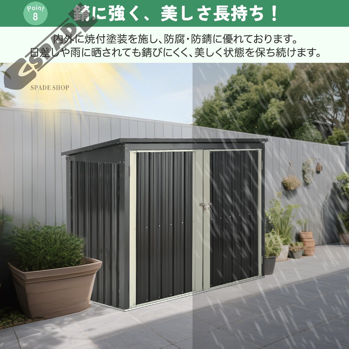 • ◎06【排水に役立つ屋根】屋根は本体よりも広く、斜面が設けられています。雨が降ると、屋根にたまることなく、斜面と凹槽を経由して地面に流れ落ちます。これにより、物置内に雨が優入する心配がなく、内部の部品をより良く保護します。
