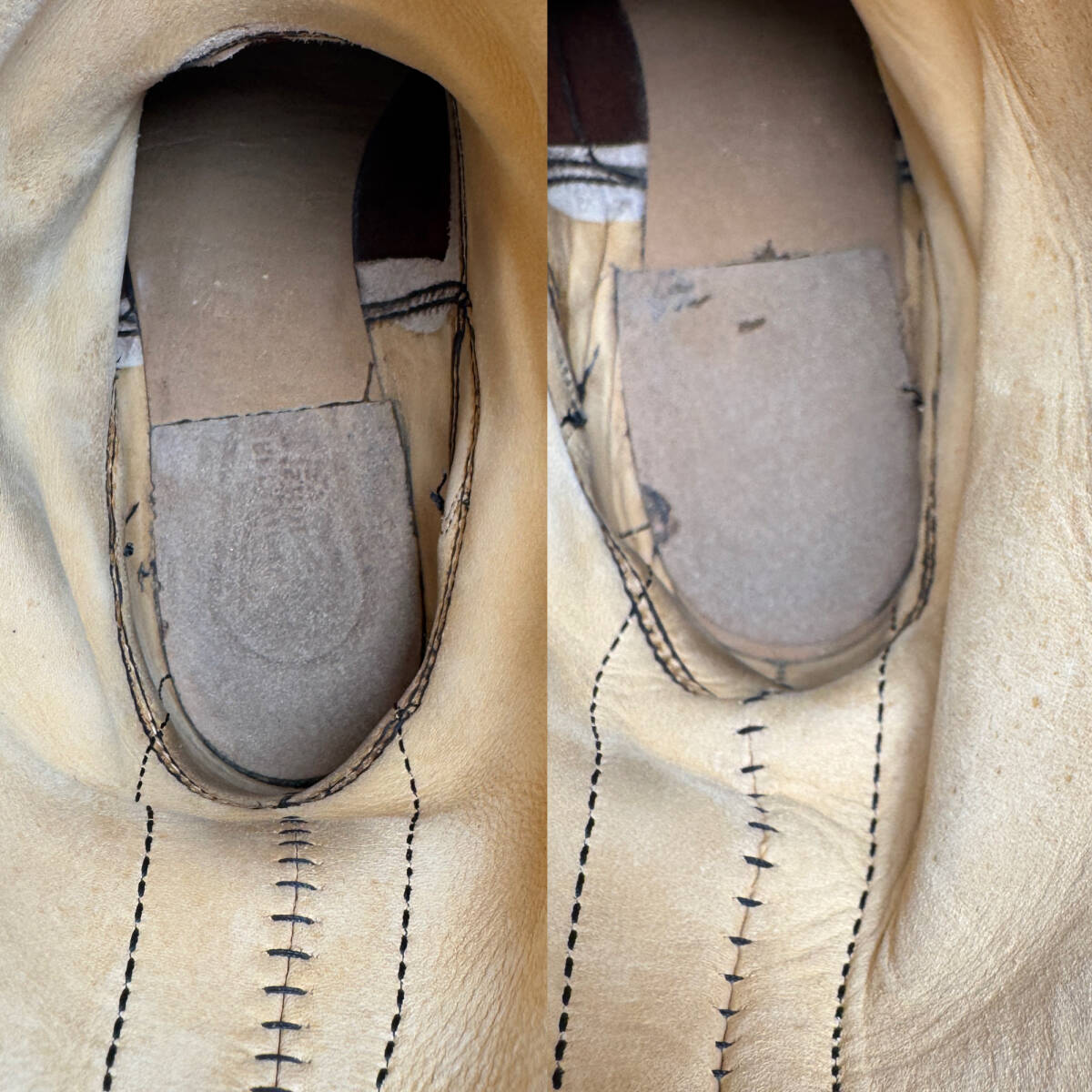 甲辺りに雨シミがうっすらありますが、履いて汚れも付いていけば気にならないレベルだと思います。画像4枚目。