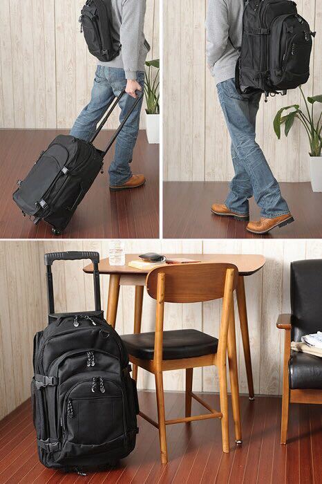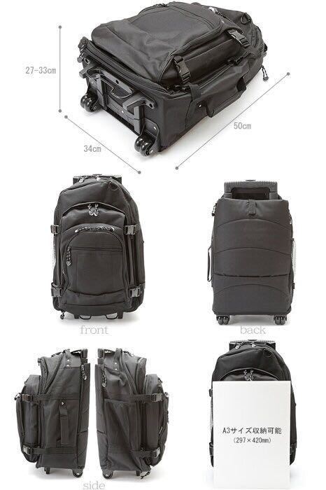 軽量な600Dポリエスターを使用したGULLWING 3wayトロリーバッグ。キャリーとしてはもちろん、ハンドル持ちや、内蔵のストラップを使えばリュックサックとしても活躍してくれる3WAYのメンズバッグです。約36L~43Lのたっぷりとしたサイズの本体は、マチ幅拡張ジッパー付きで容量可変機能を搭載。フロントポケット部分は小ぶりなデイパックになっており、ジッパーで脱着可能。機内持ち込み荷物を分けて入れるなど、使い方自由自在です。フロントにジッパーポケット、ラウンドジッパーポケット、サイドにメッシュポケットを1つずつ装備。合わせ易いブラックをご用意。旅行に、出張に、旅先で活躍するメンズキャリーケースです。