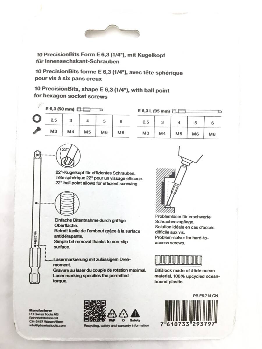 | 機能特徴 | 精密ビット、形状E 6.3(1/4″) 六角穴付きネジ用 10個セット(ビットブロック付・セルフサービスパッケージ入り) セット内容:ボールポイントビット(2.5, 3, 4, 5, 6)、ボールポイントロングビット(2.5, 3, 4, 5, 6)、ビットホルダー |