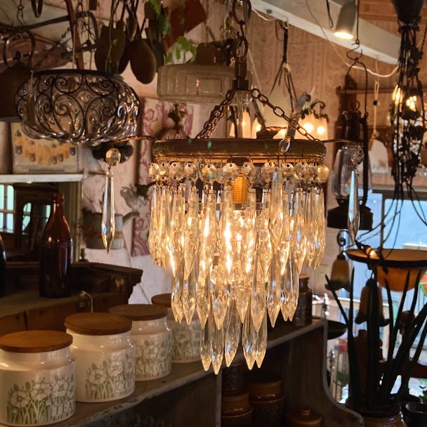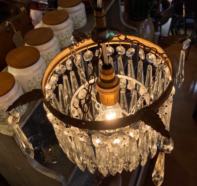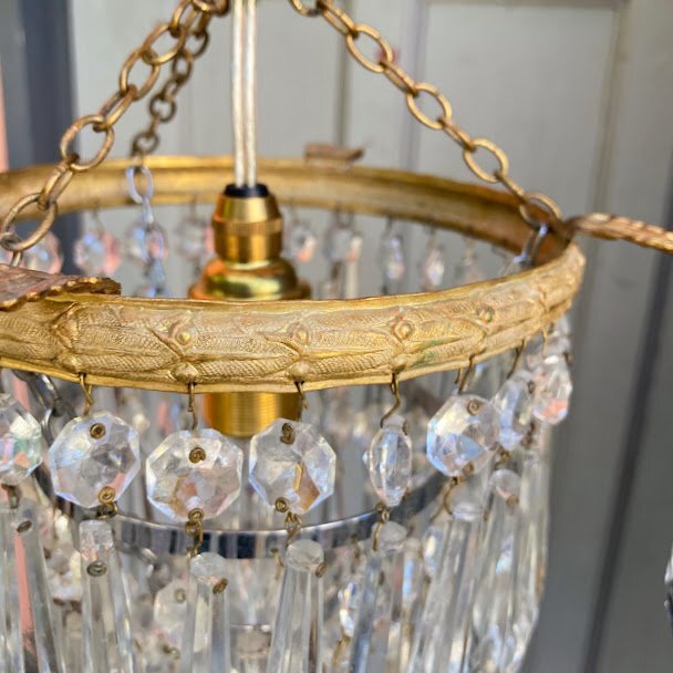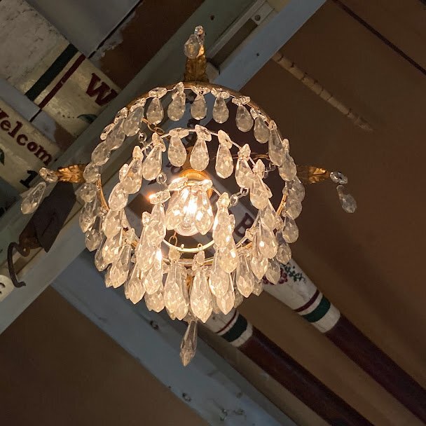 ガラスの輝きが空間を彩る、フランス製のシャンデリア【44-76B】最大直径約25cmと片手で簡単に持ち運びできるサイズ感ですが、四方に伸びた羽根のようなデザインに加え、キラキラと煌めく佇まいがとても魅力的です。1940年代。日本の電球(口金サイズE17)が使用できるように交換済み、LED電球も使えます。角型シーリングにはフックを付属しているため,、チェーンで簡単に長さ調整が可能です。お部屋に華やかさと優雅さを添える、素敵な照明をお探しの方におすすめ。一つ一つのパーツはワイヤーで引っ掛けてあるだけなので、輸送時に外れることがあります。福岡市南区の店舗にてお渡しもできますのでお気軽にどうぞ!