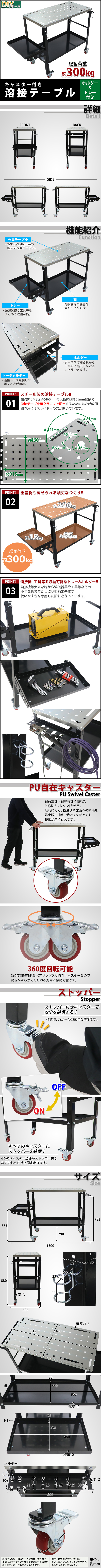 ●スチール製で大容量収納の溶接テーブルです。 ●本体重量は約21.1kgと軽量で、キャスター付きなので移動ができ、どこでも作業が行えます。 ●棚、トレー、ホルダー付きで、溶接機等の大きな物から溶接器具や工具などの小さな物まで収納できます。 ●作業テーブルには、溶接テーブル用クランプが固定できる16mmの穴が82個が開いています。 ●総耐荷重は約300kgなので必要な物を収納できます。 ●360°回転可能な自在キャスターなので動きが滑らかであらゆる方向に移動可能です。 ●全キャスターにストッパー付きなのでしっかりと固定でき、万が一の誤動作を防ぎます。 ●使いやすさに考慮した設計になっています。 ※こちらの商品は、組み立て式です。 ※組立てにはスパナ(10/12/13/17mm)、プラスドライバーが必要です。お客様でご用意ください。 ■重量:約21.1kg ■総耐荷重:約300kg(作業テーブル/約200kg、棚/約85kg、トレー/約15kg) ■材質:スチール(本体)、PU(キャスター) ■付属品:組立図 ★ご購入前の注意事項★ ★1階車上でのお渡しとなります。恐れ入りますが荷降ろし・搬入は、お客様にてお願い致します。 ●新品商品ではありますが、輸入商品の為、多少の擦り傷などがある場合がございますので、ご納得の上ご購入下さいませ。 ●ご購入後、お客様ご都合によるご返品、ご返金等は一切お受け致しておりません。 ●本商品を使用した際に発生したトラブル、事故につきまして、当社は一切の責任を負いません。ご使用に関しましては、全て自己責任にてお願い致します。 |