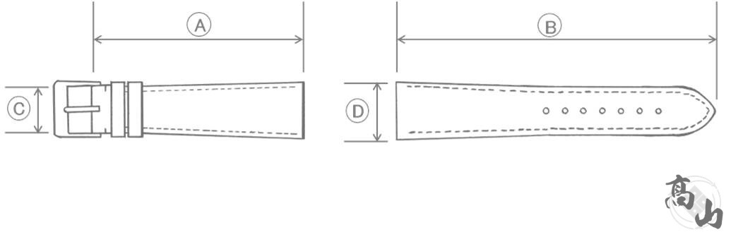 サイズ:A(12時側):約70mm / B(6時側):約135mm / C(尾錠幅):18mm / D(ラグ幅):20mm
