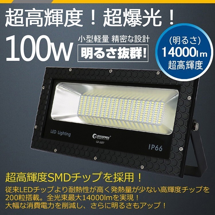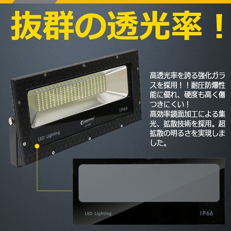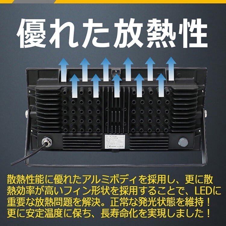 | ★オススメポイント★ 放熱性・防水性能に優れた高輝度・省エネの100w LED投光器です。 これ一台で闇夜も真昼の明るさに!細かな作業も可能な強烈な明るさをご提供致します。 看板や屋内・屋外イベント・店舗の常設用として最適! 【高輝度の14000LM!新商品の省エネLED投光器】 200個の超高輝度SMD 5730を均一に並べたLED基盤。 6000~6500Kの色温度。 約120度の広範囲を照射。 約14000ルーメンの圧倒的な明るさを実現し、同等品より30%明るさアップ!! 【2種類のステーで最適な照射角度を実現!】 縦・横両方に設置可能な2種のステーを付属しました。 照射面を水平に変更したり、縦に変更したりと用途に応じてご選択頂けます。 壁掛け・床付け・天井などの取り付けに対応できます。 しかもステーは180度調整可能で様々なシーンにご利用頂けます。 【熱発散が速い 長寿命】 ヒートシンクを採用し安定した温度に保ちます。 従来品より更に優れた放熱性で効果的に寿命を延ばします! 【密封性に優れ、IP66等級の防水性能を】 コーキングを強化することで、IP66相当の防塵・防水性能を実現! IP66防水レベルで、室外や室内の照明と広告看板、掲示板など様々な場所でご利用頂けます。 倉庫・作業場・安全照明としても最適です! 【平均演色評価数Ra80以上!】 高輝度LED素子を搭載し、自然に近い純粋な色味を再現。 優れた演色性によりひときわ明るく、対象物の本来の色味を損ないません。 【優れた堅牢性!耐衝撃、耐振動】 耐衝撃、耐振動、丈夫な設計で安全性・安定性・信頼性抜群 作業場で求められる強靱なボディを備え、高い堅牢性を提供します。 【AC85~265Vの電圧に対応!】 電圧はAC85~265Vの広範囲で利用可能! 電圧の心配なくあらゆる国・場所で快適にご利用いただけます。 【新設計の薄型ボディで従来品より更に設置場所が広がります!】 海苔漁・シラス漁での常夜灯。夜釣りの照明。集魚灯などさまざまな場面で活躍! 看板灯、駐車場灯、インテリア照明・ 樹木や店舗壁面などのライトアップ照明に!看板照明や店内の演出用照明! 公共場所、駐車場、事務所、展示場に使用、作業灯 駐車場灯、看板灯、街灯、公園、ホール、玄関常夜灯、町内防犯灯として使用! 一定の明るさが必要とされる検品作業を行う際の照明や、夜間作業を行う際の照明など様々な場面で活用頂けます。 屋外用照明としてもご利用頂けます |