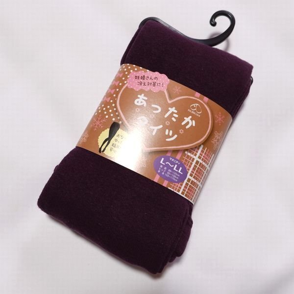 犬印本舗の、前後マチ付きで臨月までおなかにふんわりフィットするマタニティタイツで、カラーはシックなパープルです。