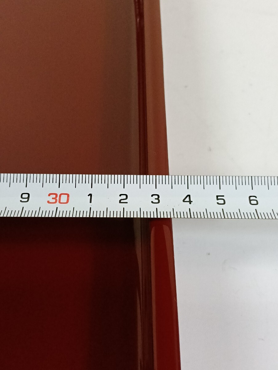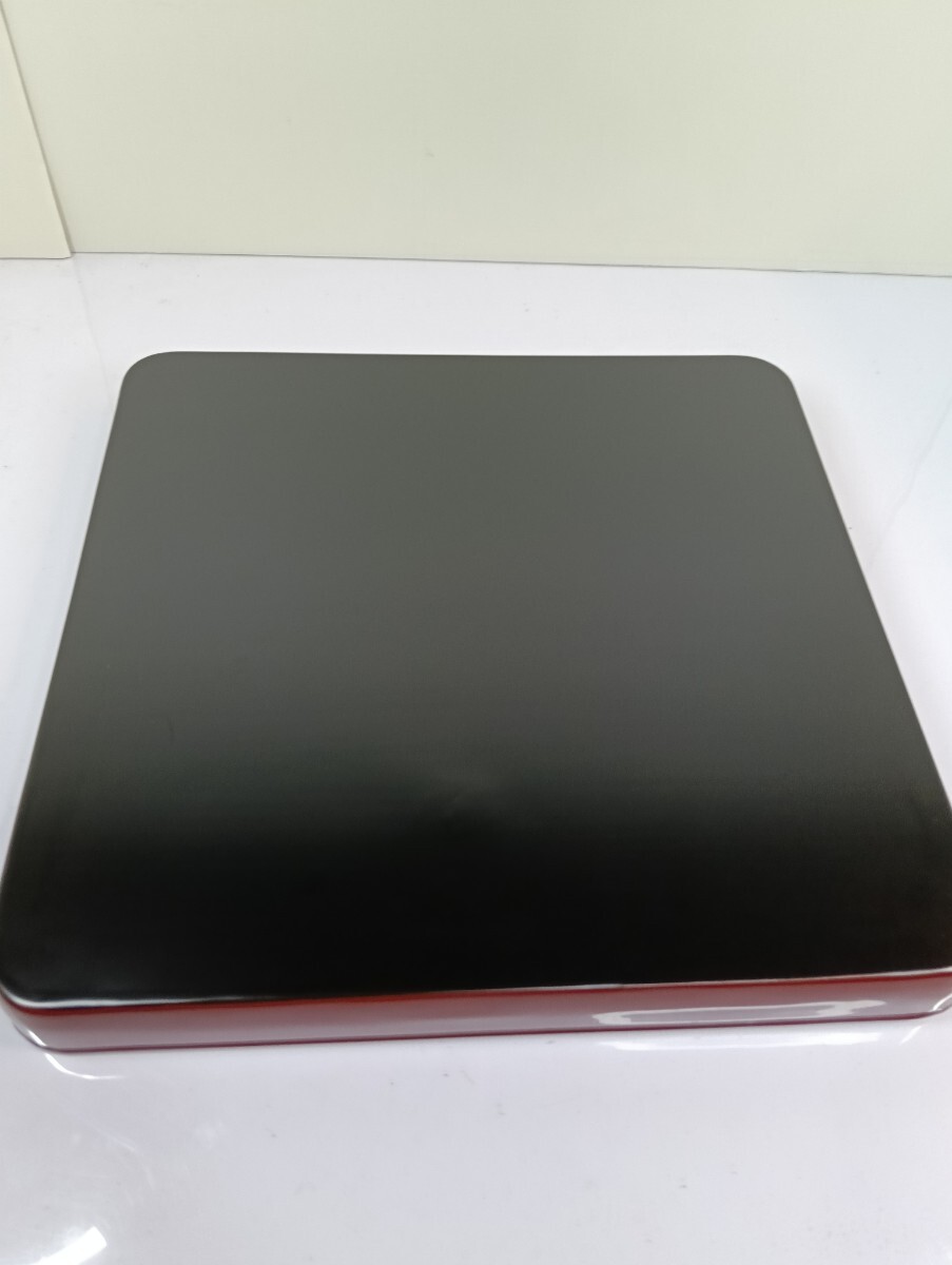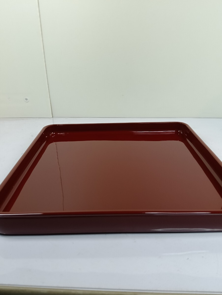 日常使いに便利な、朱色と黒のコントラストが映える角盆です。