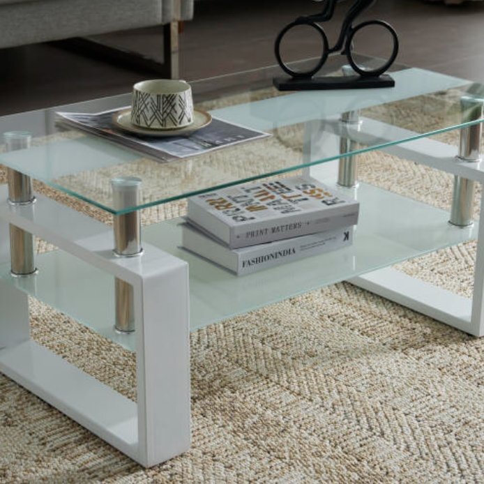 【国内発送】ガラステーブル ローテーブル コーヒーテーブル 幅87.5x奥47.5x高さ39.5cm 収納棚 口字型のテーブル脚 強化ガラス天板 クリア