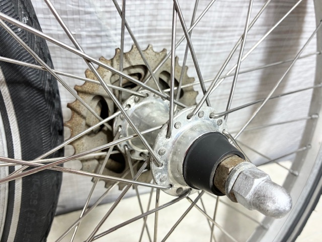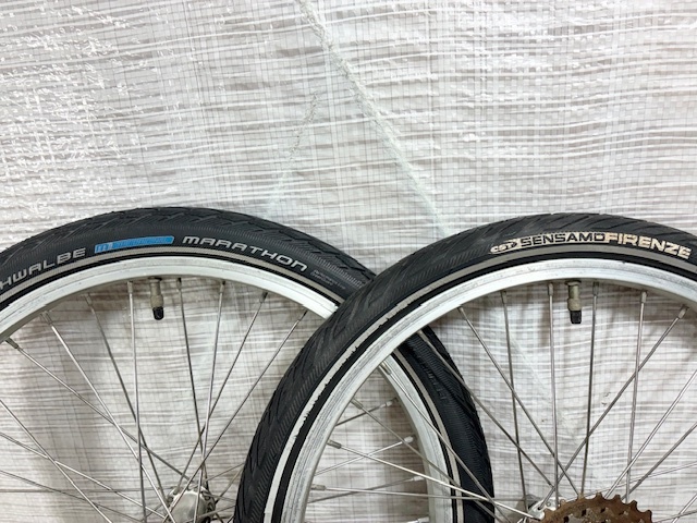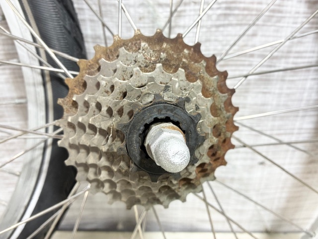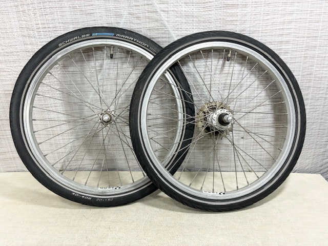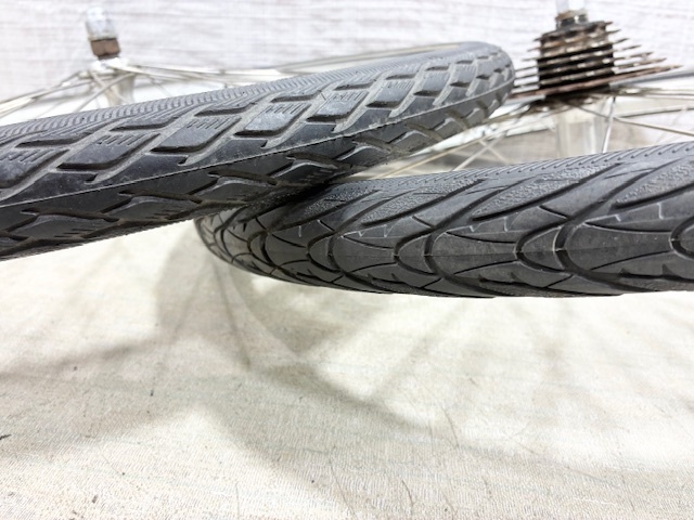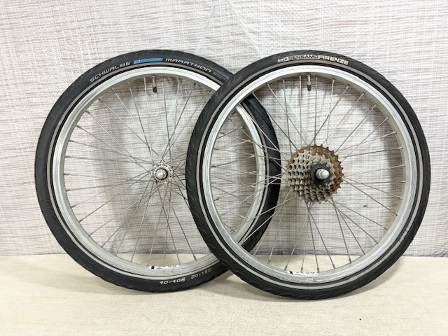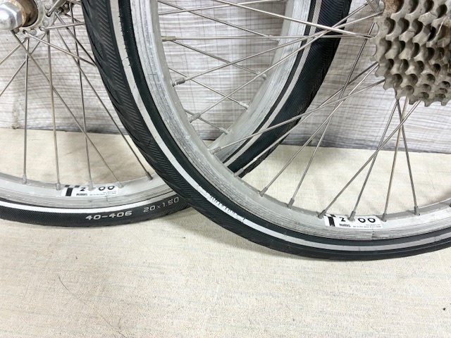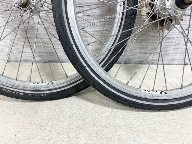 アレックスリム20インチホイールの出品です、ハブのエンド幅フロント100㎜リア135㎜ シマノ7速スプロケット11〜28T タイヤはメーカー違いますが前後とも1.50 ナット締めタイプ 406 回転スムーズでブレほとんどありません、サビがあります、
