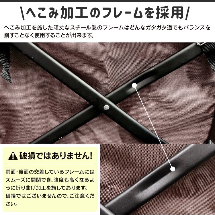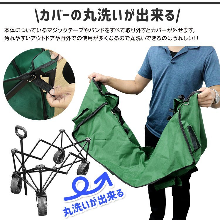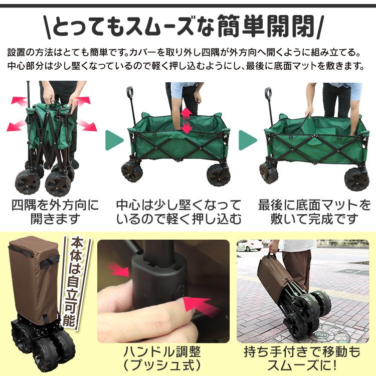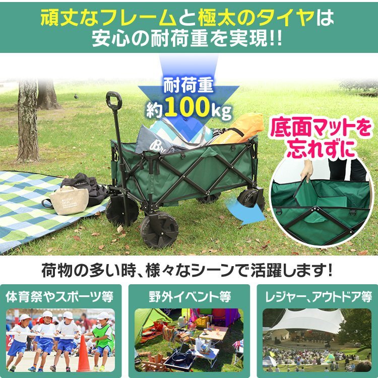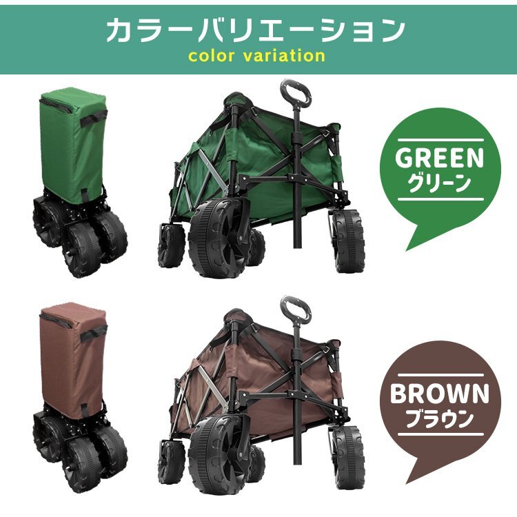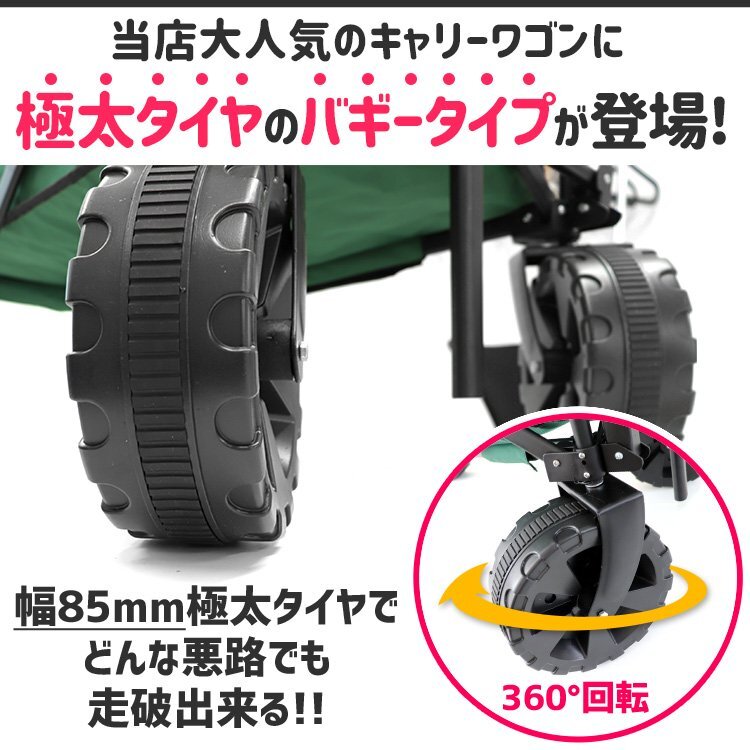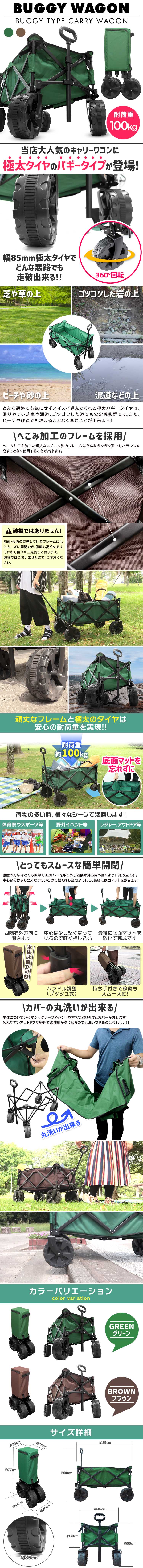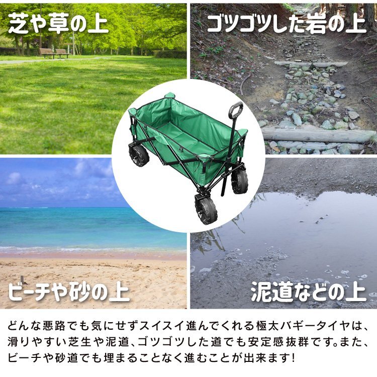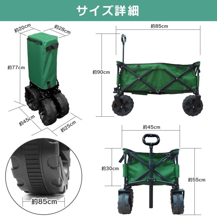当店人気のキャリーワゴンに極太タイヤのバギータイプが新登場! 幅85mmの極太タイヤとへこみ加工を施した頑丈なスチール製のフレームで安定感抜群! 滑りやすい芝生や泥道、ゴツゴツした岩道など、どんな悪路でもスイスイ進めます! 安心の耐荷重100kg! 折りたたみ式なので、車への積み込みもラクラク! 汚れやすいカバーは丸洗いできます。 アウトドアやお買い物の運搬時にとても便利なキャリーカートは レジャー時など車の中に入れて置くだけで大活躍する頼もしいアイテムです。 【商品仕様】 カラー:グリーン サイズ:本体:(約)幅45×奥行85×高さ55~90cm 折りたたみ時 :(約)幅25×奥行45×高さ77cm タイヤサイズ(幅):(約)8.5cm 材質:スチール、ポリエチレン、ゴム他 本体重量:約10kg 耐荷重:(約)100kg 【商品内容】 寝袋 ×1 キャリーバッグ 【注意事項】 ・用途以外(イス・踏み台等)に使用しないで下さい。 ・ブレーキはありません。 ・ハンドルは必ず伸ばした状態で使用して下さい。 ・折りたたみをするときに指を挟まないように注意して下さい。 ・仕様・デザインは改良のため予告なく変更することがあります。 保証期間 7日 ※使用開始時期や使用期間に関わらず、お買い上げ日から7日間です。 商品到着後から7日を過ぎますと、交換の際の往復送料はお客様負担となりますのでご了承ください。 場合によっては対応出来ないケースもございます。 |