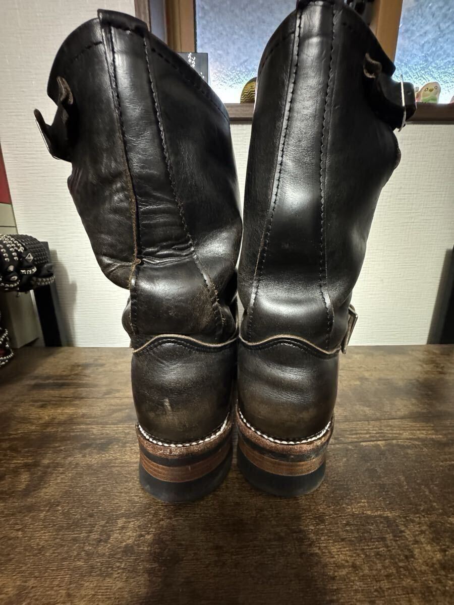 以前9/1/2として購入しましたが、あきらかに小さく、サイズ表記が見えなくて当方、履けるには履けますが爪先に逃げが無いくらいジャストで足が痺れる状態ですので出品に至りました。ソールはカスタムされており、爪先はスチール無しのフラットボックスになっていてサイズが合えば最高の一足です。ステッチは踵まで一周しており、今後ヒールの剥がれは心配ないです。白ステッチで少し雑な感じですが、それ程気にならないかと思います。神経質な方はお控え下さい。目立つダメージ(傷などは無く)クリッピングも綺麗に残っており爪先やシャフトに茶芯が出て渋いです。