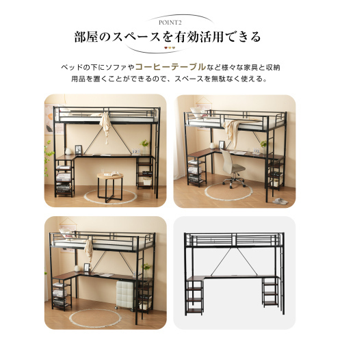 【部屋のスペースを有効活用できる】ベッドの下にソファやコーヒーテーブルなど様々な家具と収納用品を置くことができるので、スペースを無駄なく使える。【おしゃれなデザイン】木材やスチールの組み合わせはビンテージで、洗練されたスタイルを体現している。レトロでありながらすっきりとした上品さのある質の良いデザインで、落ち着きのある素敵な空間を演出していただける。【1台3役】 ①ベッドとして② 2人で並べる超ワイドL字デスク97*194cmの広々L字デスクのワークスペースで、カップルや友人の並んでの勉強・仕事が快適に。省スペース設計ながら、十分なゆとりサイズでストレスフリー。③収納棚付き二つの三段ラックの収納棚が付く。コミックや教科書、辞書や、小物など邪魔にならず棚として活用できる。【階段 収納ラック は左右どちらでも設置可能 】部屋のレイアウトや家具の配置によっていつでも調整でき、左右どちらでも取付けが可能となる。【収納棚付き】三段ラックの収納棚が付く。コミックや教科書、辞書や、小物など邪魔にならず棚として活用できる。【たっぷりの収納スペース】一人暮らしで物を収納するのに十分なスペースがなく、ワンルームに住んでいる人にぜひおススメのロフトベッド。ベッド下のスペースを無駄にせず、物を収納する場所がないことに悩んでいる人も安心です。【幅広設計のハシゴ】うっかり足が滑ったり、立っていなくて転んだりするのを防ぐために作られた幅広設計で、より安全性が高い!【頑丈な設計で安心安全】耐荷重は約200kg、ベッドが揺れる心配もなく心地よい体験と確かな安定感でお客様の睡眠を守る。【通気性抜群のフレーム構造】メッシュ床は通気性が良く、アイアンをクロスさせた、湿気がこもりにくいので、カビやダニ対策にも完璧!