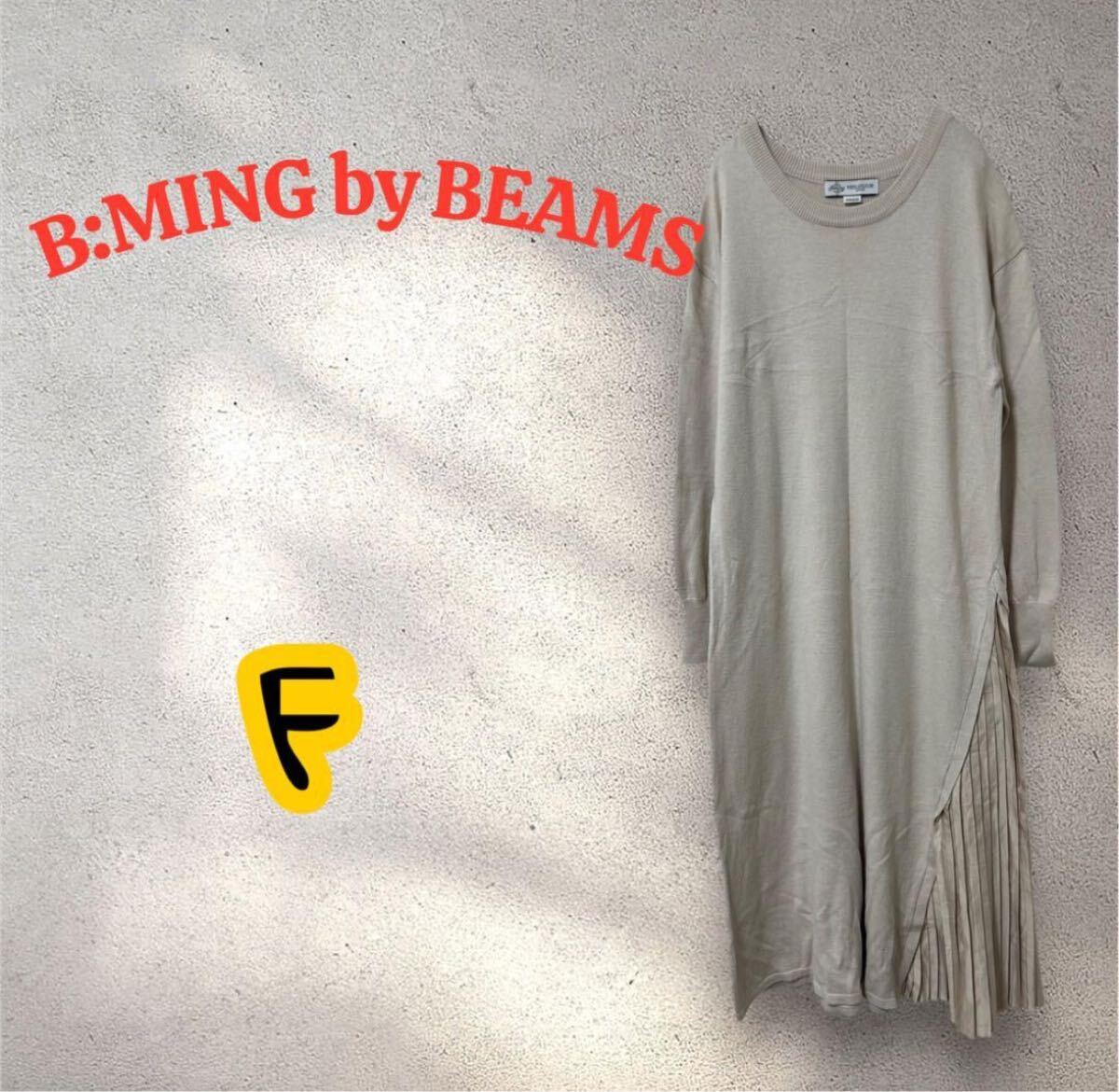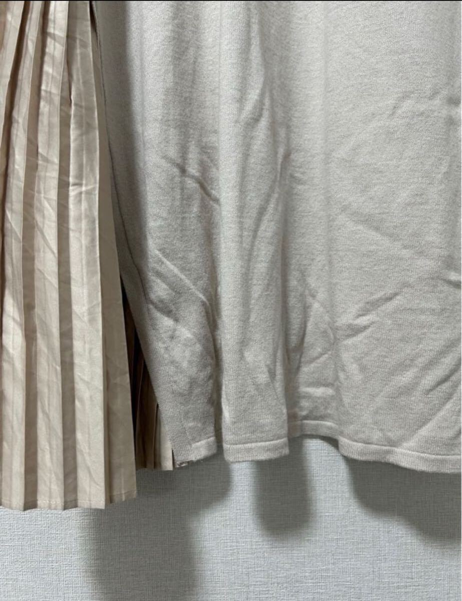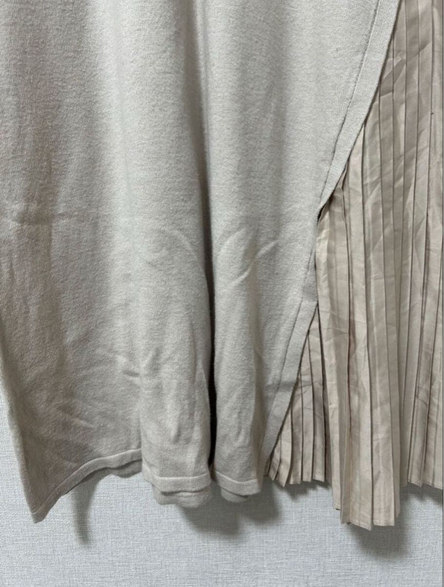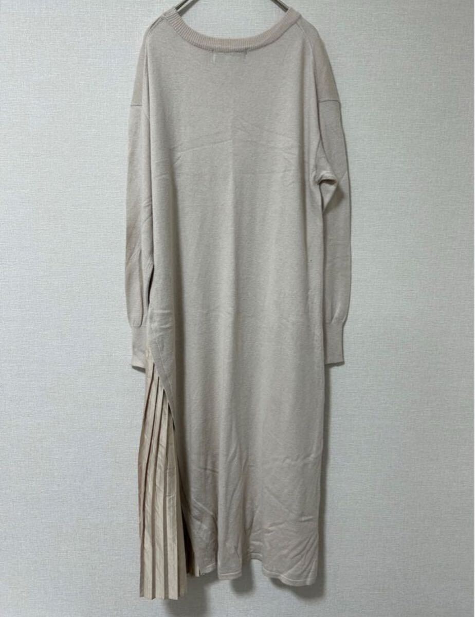 ベージュのサテン風プリーツデザインのロングワンピース。