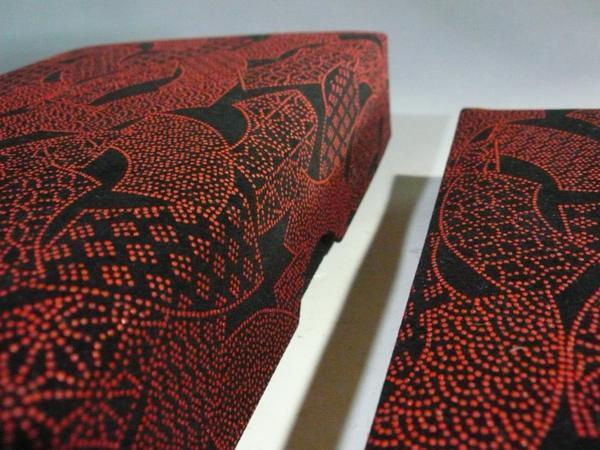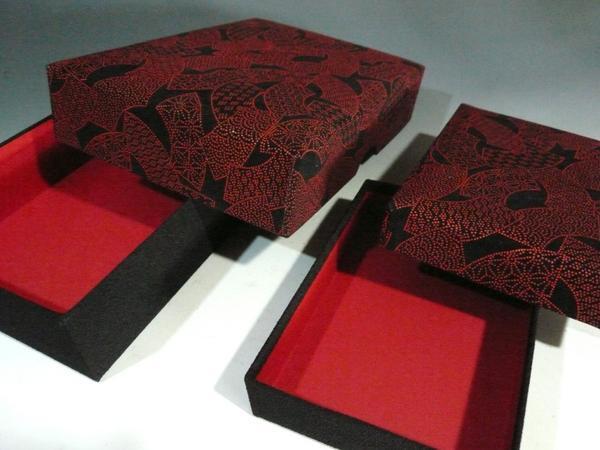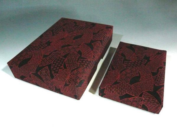 未使用 大、横20.5cm、縦28.5cm、高さ7cm。小、横14.5cm、縦20.5cm、高さ4.3cm。固い紙に布が巻かれています。色々な所で活躍しそうな小箱です。ノークレーム、ノーリターンでお願い致します。この他にも出品しておりますので、ご覧下さい。ここをクリック
