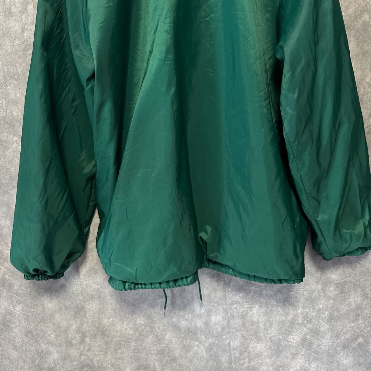 深みのあるグリーンカラーが落ち着いた印象を与える一枚で、ナイロン特有の光沢感と裏地のコットンライナーがポイント。