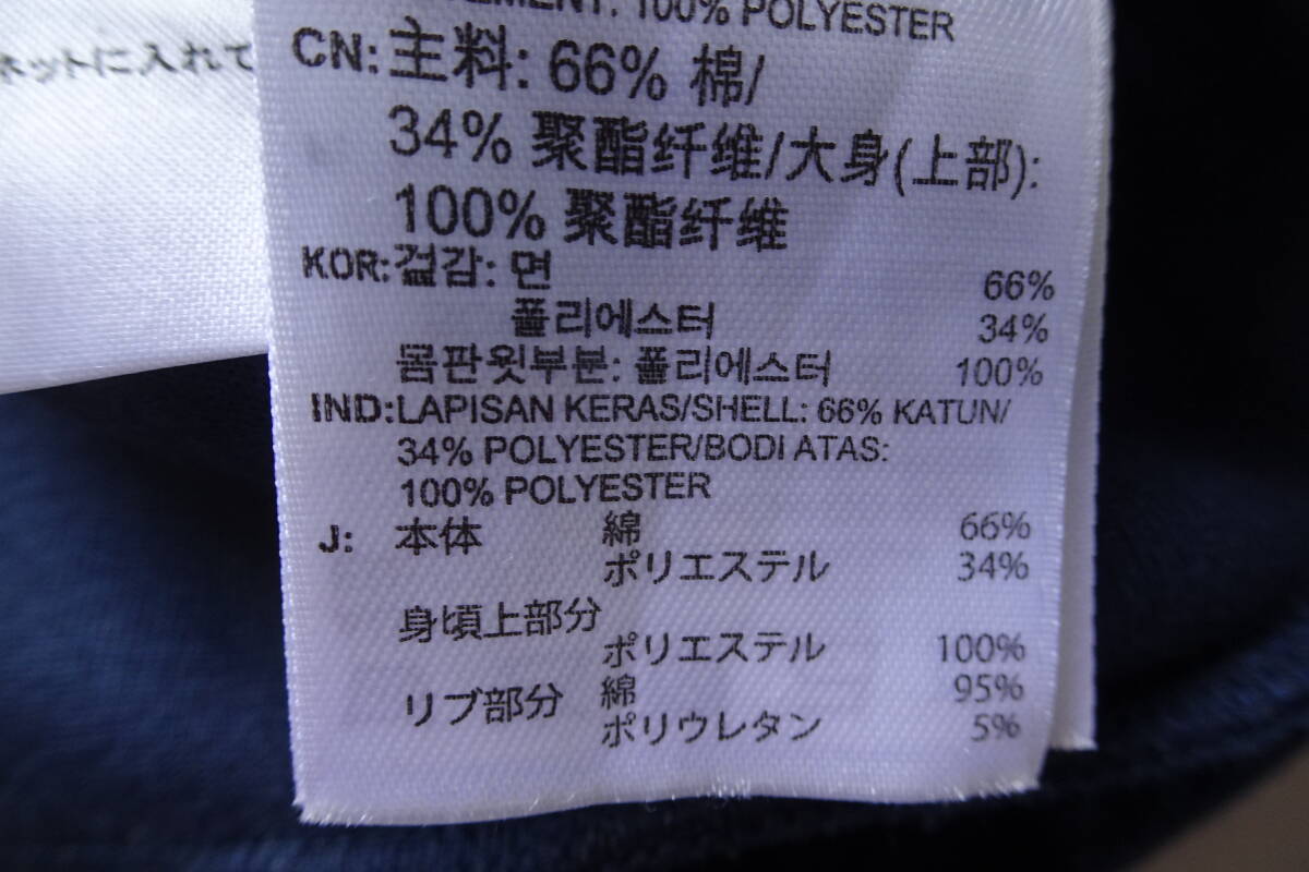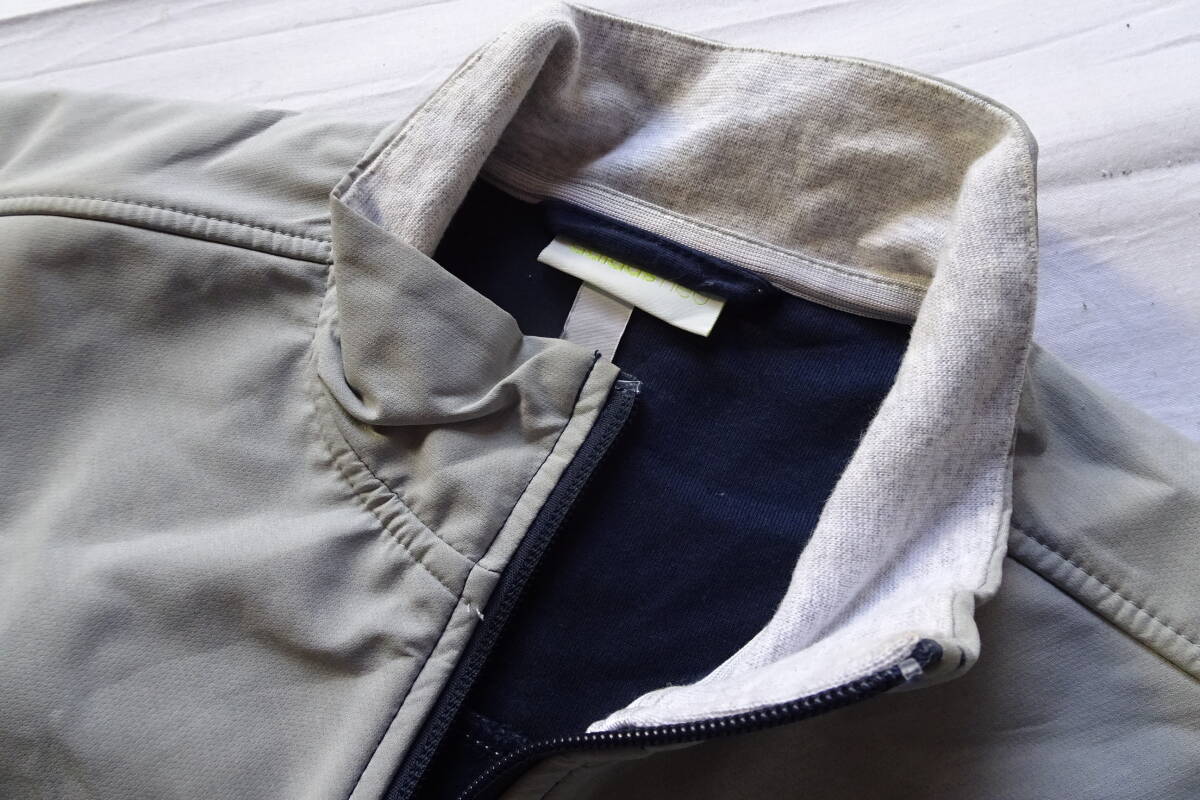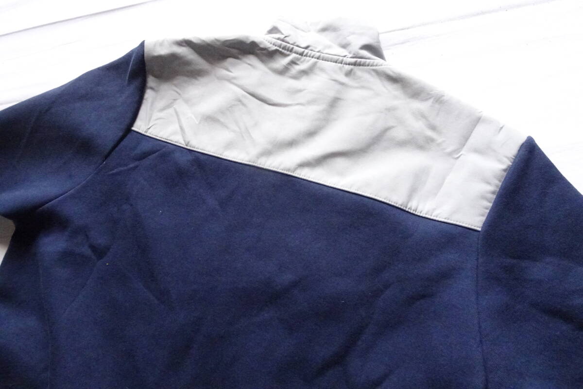 肩ヨーク部分、グレーのナイロン系素材貼付け縫いです。