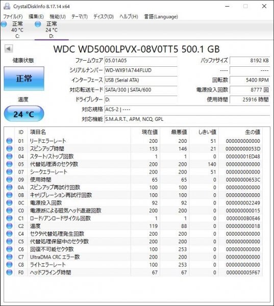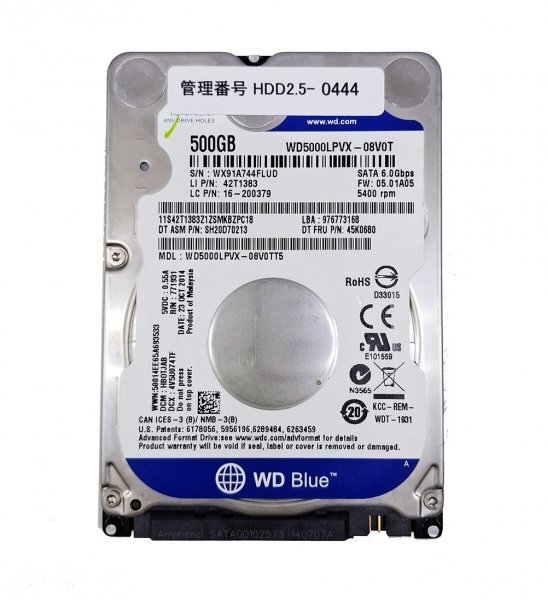 ・Model :WDC WD5000LPVX-08V0TT5 ・Serial Number :WD-WX91A744FLUD ・Disk Size :500GB ・Rotation Rate : 5400 RPM ・ディスク消去・フォーマット済み |