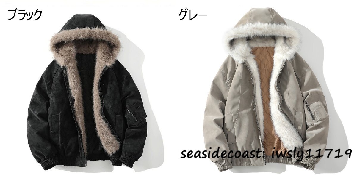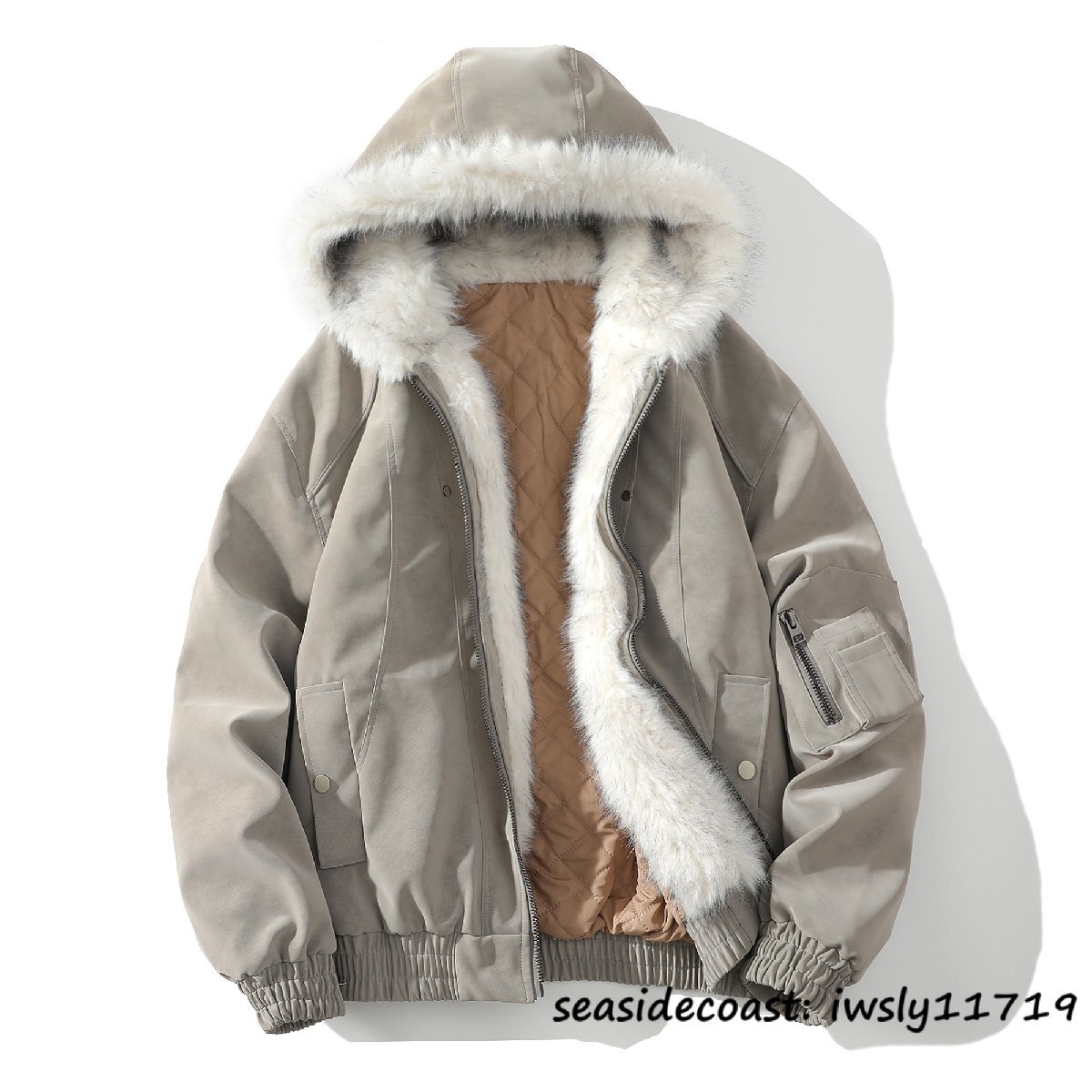 超美品★ブルゾン メンズ 保温 防寒防風 厚手 ファーコート フード付き 秋冬 ムートンコート パーカー アウター ジャケット グレー 2XL