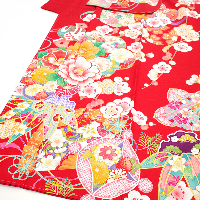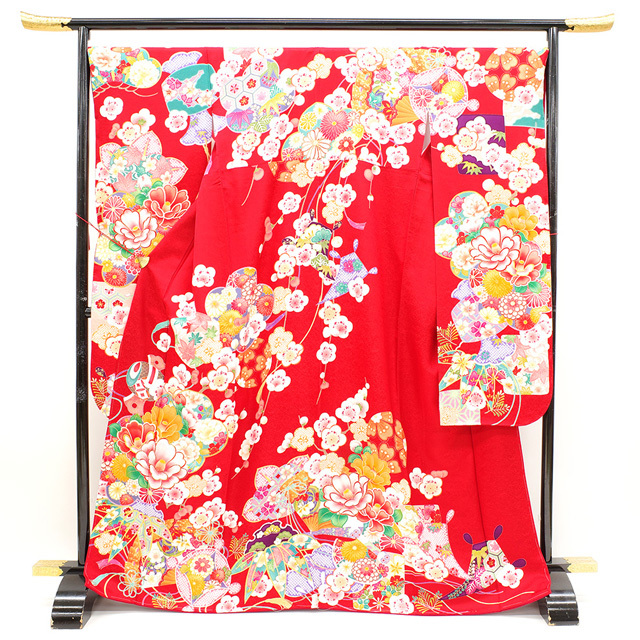 【新品】 振袖 袷 着物 刺繍 金彩加工 正絹 赤 椿 桜 梅 四季の花 打ち出の小槌 扇 古典柄 成人式 二十歳 20歳 結婚式 結納など フォーマル 販売 購入 未使用 綺麗 新品 仕立て上がり 身丈170.5 裄68 Lサイズ みやがわ sb11734