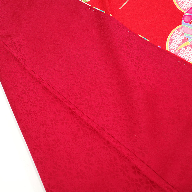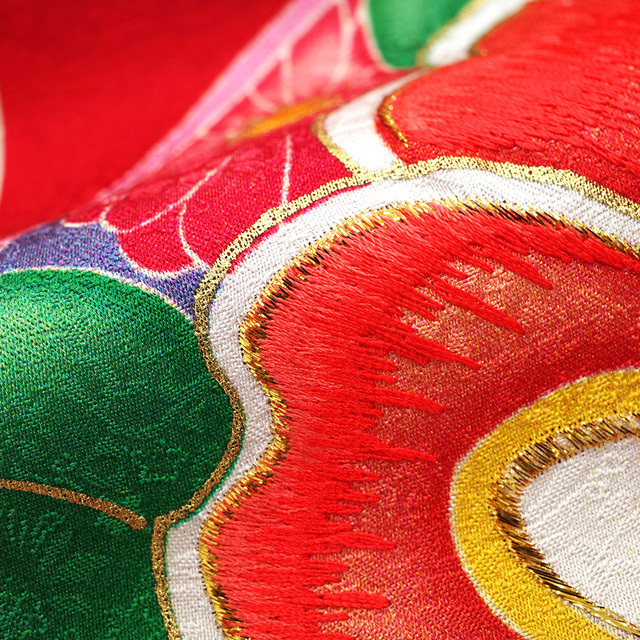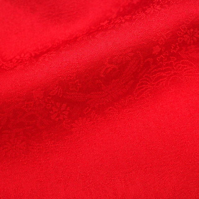 鳳凰や花などの地紋が施されたこちらのお着物は、赤色が素敵な地。
