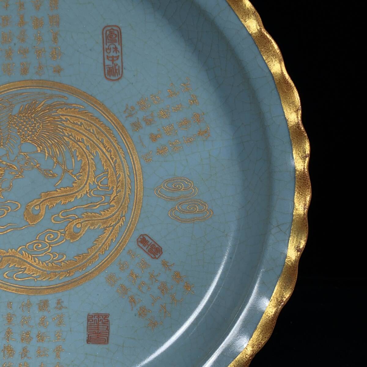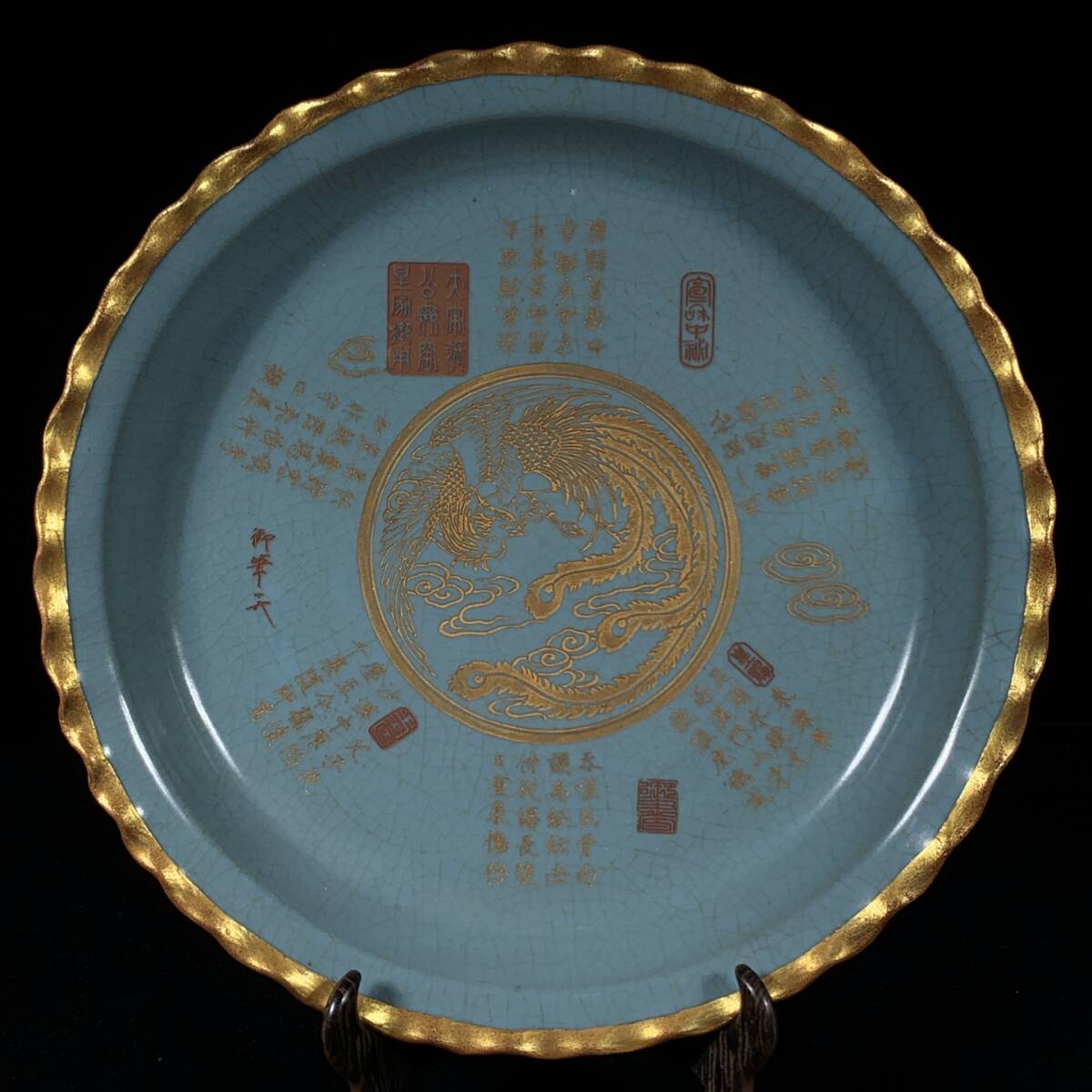 【超珍館蔵】宋 古陶瓷品 汝窯 包口 銘文 鳳紋 花口盤 陶藝 古賞物 古董品 古美術品 時代物 旧家蔵出 稀少珍蔵品110519