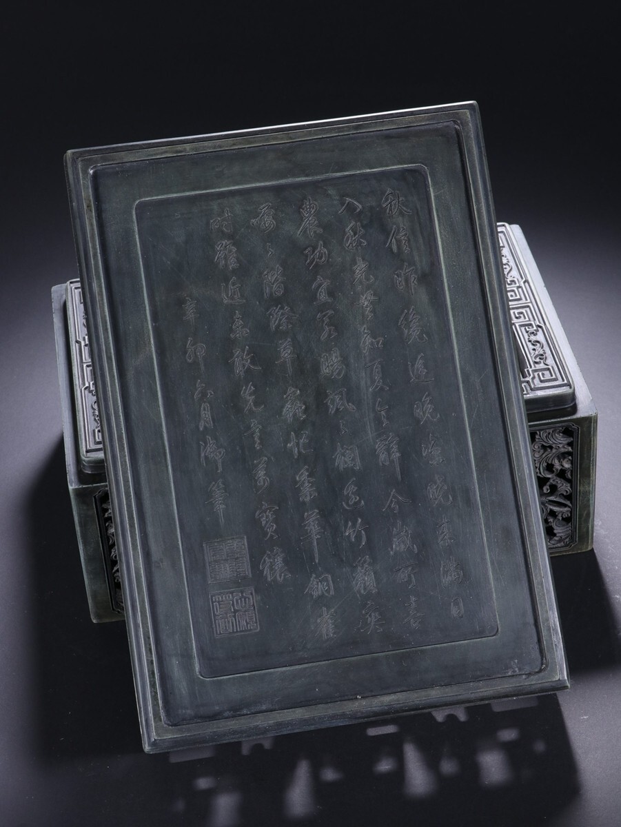「古端石硯 花草紋文房端渓套硯 暖硯 乾隆宸翰銘 清時代」手彫り 文房四宝 書道具 中国古美術 旧蔵出