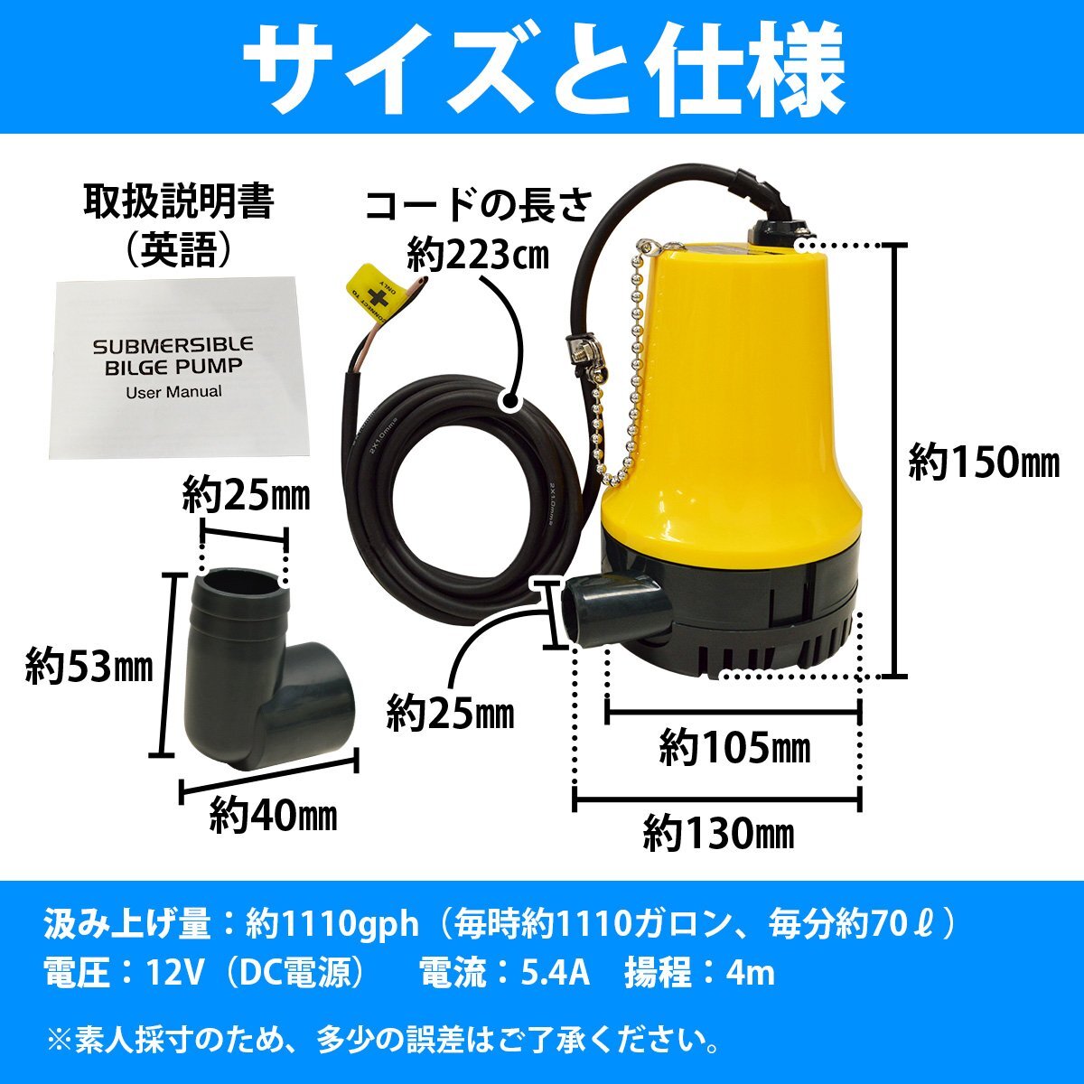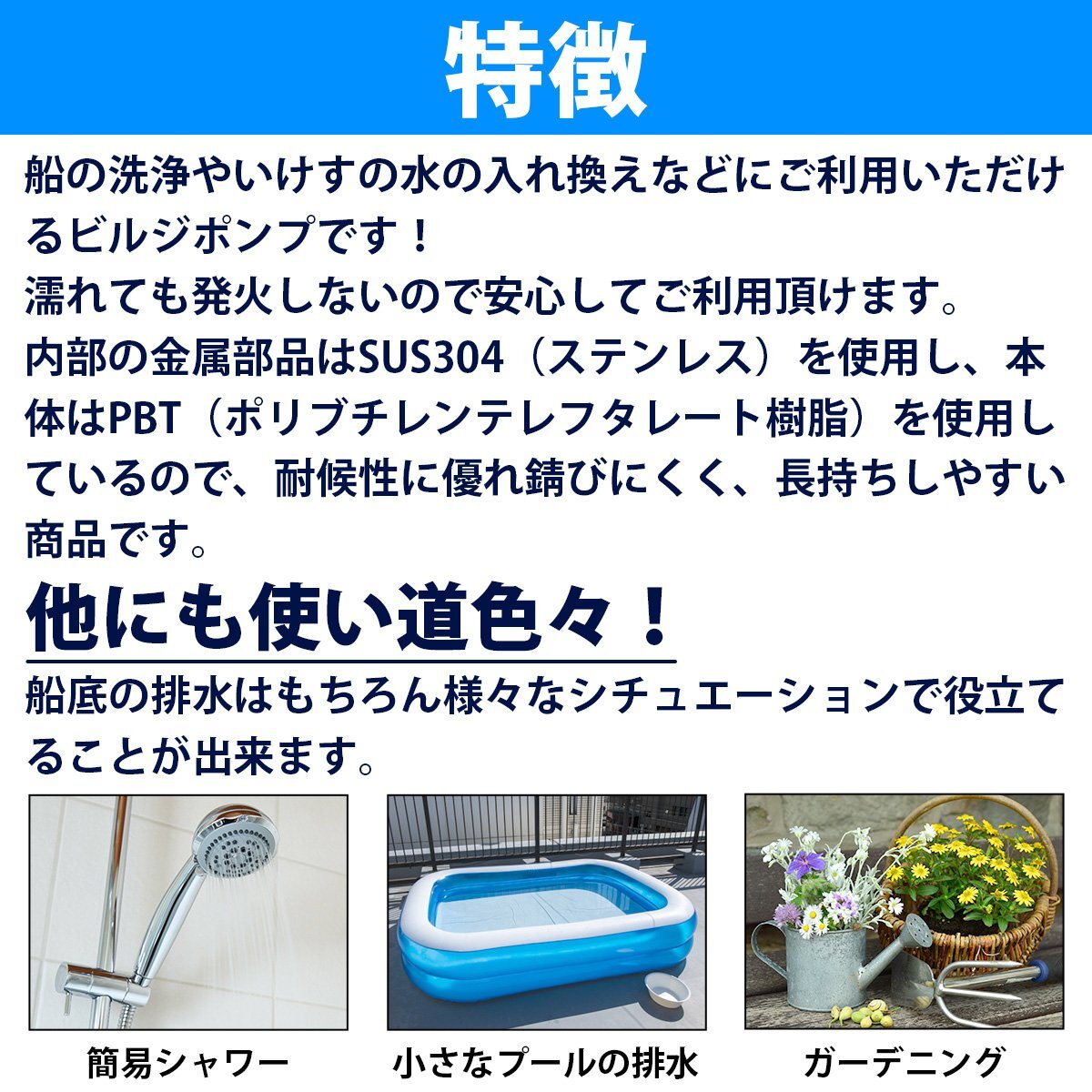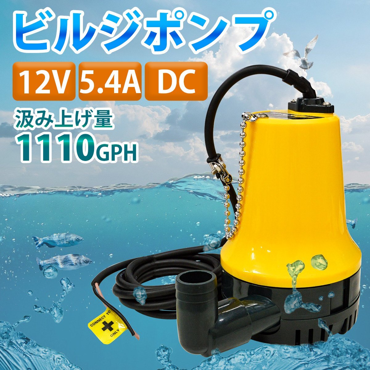 12V ビルジポンプ 1100GPH 海水 対応 毎分69L 水中ポンプ 船 ボート ヨット 船舶 漁船 汲み上げ ポンプ ガーデニングにも