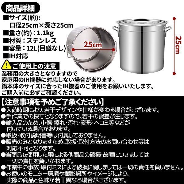 寸胴鍋 調理器具 蓋付き 大容量 12L 25cm ステンレス ガス火IH兼用 目盛付き 寸胴鍋 ふた付き 業務用 炊き出し 331