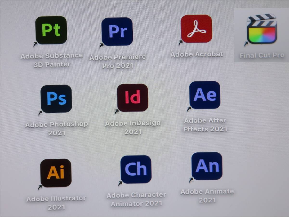 ◆ Macの搭載ソフト: Photoshop CC2021・Character Animator CC2021・Substance 3D Painter・InDesign CC2021・Premiere Pro CC2021・After Effects CC2021・ Illustrator CC2021・Premiere Pro CC2021 ・Acrobat Pro CC2021搭載(画像参照)。