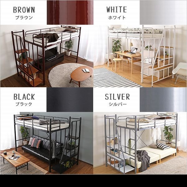 | 【ポイント】 ①収納スペース付きの昇り降りがしやすい階段付きロフトベッドです。 ②左右どちらでも設置可能な、宮棚&左右スライド式の2口コンセント付きです。 ③2段階の高さ調節(ハイ・ミドル)が可能です。 ④左右入れ替え可能な、衣類収納に便利なハンガーパイプ1本付きです。 |