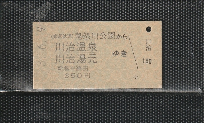 東武鉄道 鬼怒川公園から川治温泉・川治湯元 A型 青地紋 東武>野岩鉄道 連絡 硬券乗車券 未使用券