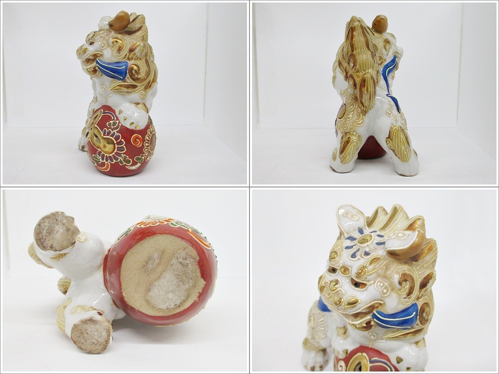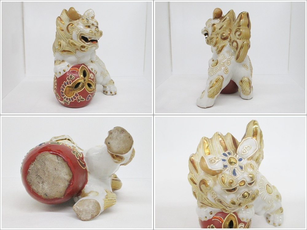 B25-2158 九谷焼 玉獅子 玉乗り獅子 2体セット 金彩 白 1対 厄除け 招福 縁起物 置物 陶芸 伝統工芸 小さめ 高さ約13㎝ 中古 経年保管品