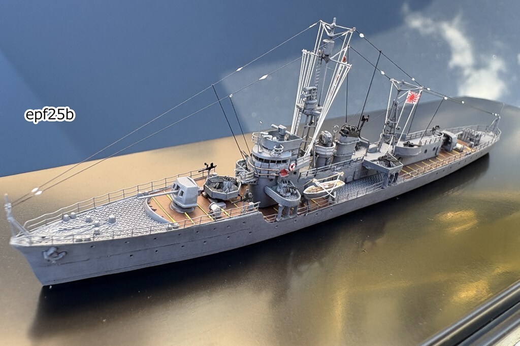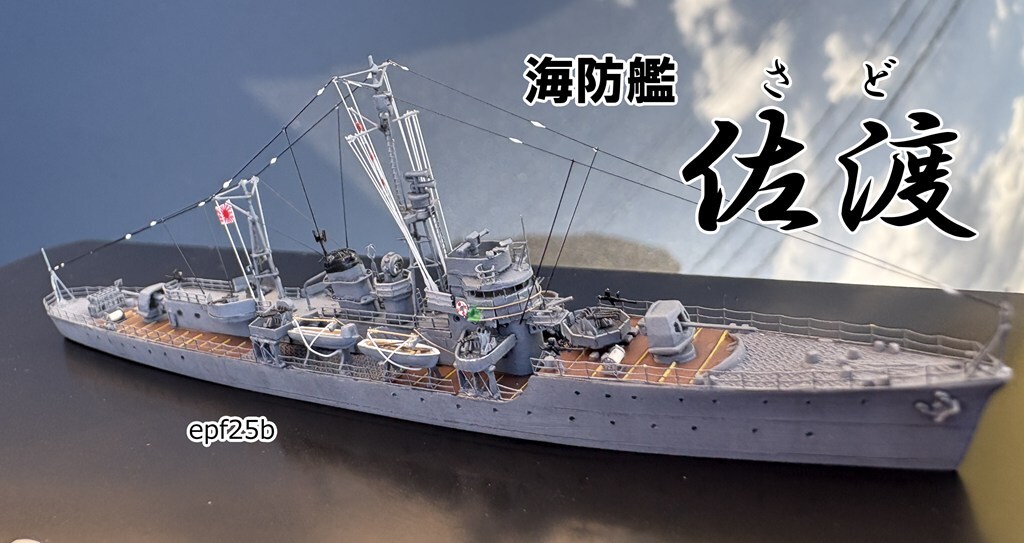 ご覧いただきありがとうございます キットはピットロード製です。 資料は写真集を参考に作製しています。 手直しした箇所は ①船体はパテで修正しています。 ②船体のつなぎ目の跡を再現しています。 ③船体の窓は穴をあけなおしています。 ④リノリウム押さえ金具はランナーで再現しています。 ⑤リールはエッチングで再現しています。 ⑥砲塔のカバーはのぞき窓を開口しています。 ⑦機銃座はエッチング・プラ材で再現しています。 ⑧艦橋の防弾板は自作しています。 ⑨機銃は社外品を使用しています。 ⑩ボートダビットは社外品を使用しています。 ⑪機銃座支え柱は自作しています。 ⑫艦橋は窓枠・手すり・はしごなどをエッチングで再現しています。 ⑬8㎝迫撃砲台座は自作しています。 ⑭8㎝迫撃砲も自作しています。 ⑮マストはプラ材・真鍮で再現しています。 ⑯探照灯は社外品を使用しています。 ⑰爆雷装填台はエッチングで再現しています。 ⑱煙突はジャッキステイをエッチングで再現しています。 ⑲煙突のカバーは真鍮で作り直しています。 ⑳炊事煙突は真鍮で作り直しています。 21)砲身は真鍮製に交換しています。 他にもありますので、是非お手にとって御覧下さい。 海防艦 佐渡 「佐渡」は択捉型3番艦として昭和18年3月に日本鋼管鶴見造船所にて竣工しました。 本級は建造中に、軍艦から海防艦に移され、占守型と比べ艦政上から多くの簡易化が可能となりました。対空用に25ミリ連装機銃2基、対潜用爆雷36個を搭載していましたが、護衛艦としてその兵装はあまりにも貧弱でした。 本艦は19年8月22日、船団を護衛して台湾からマニラへ向かう途中、マニラ湾口で米潜水艦「ハッド」の雷撃を受けて撃沈しました。 |