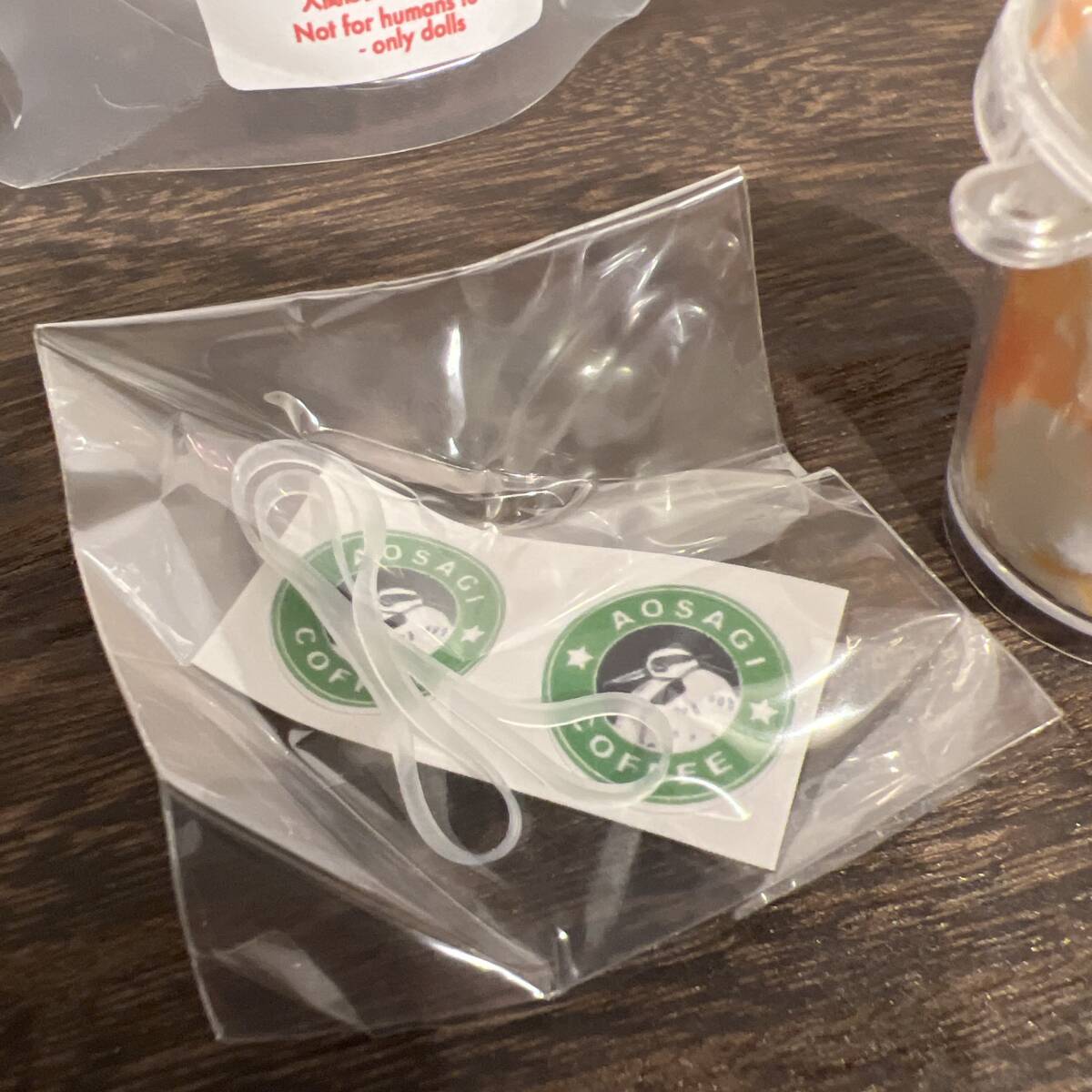 ドールの手に固定するためのゴムバンドやフラペチーノに貼るロゴのシールも未使用です。