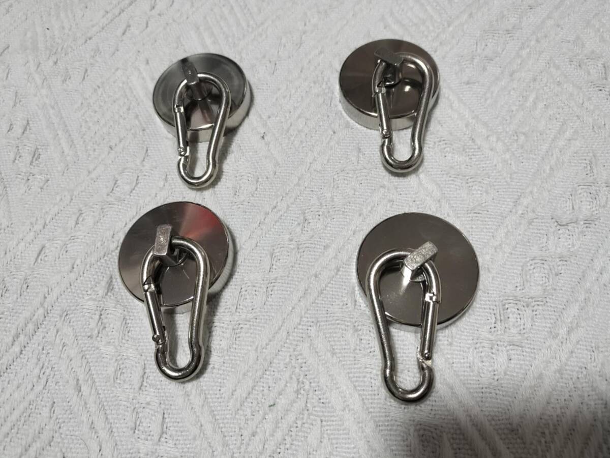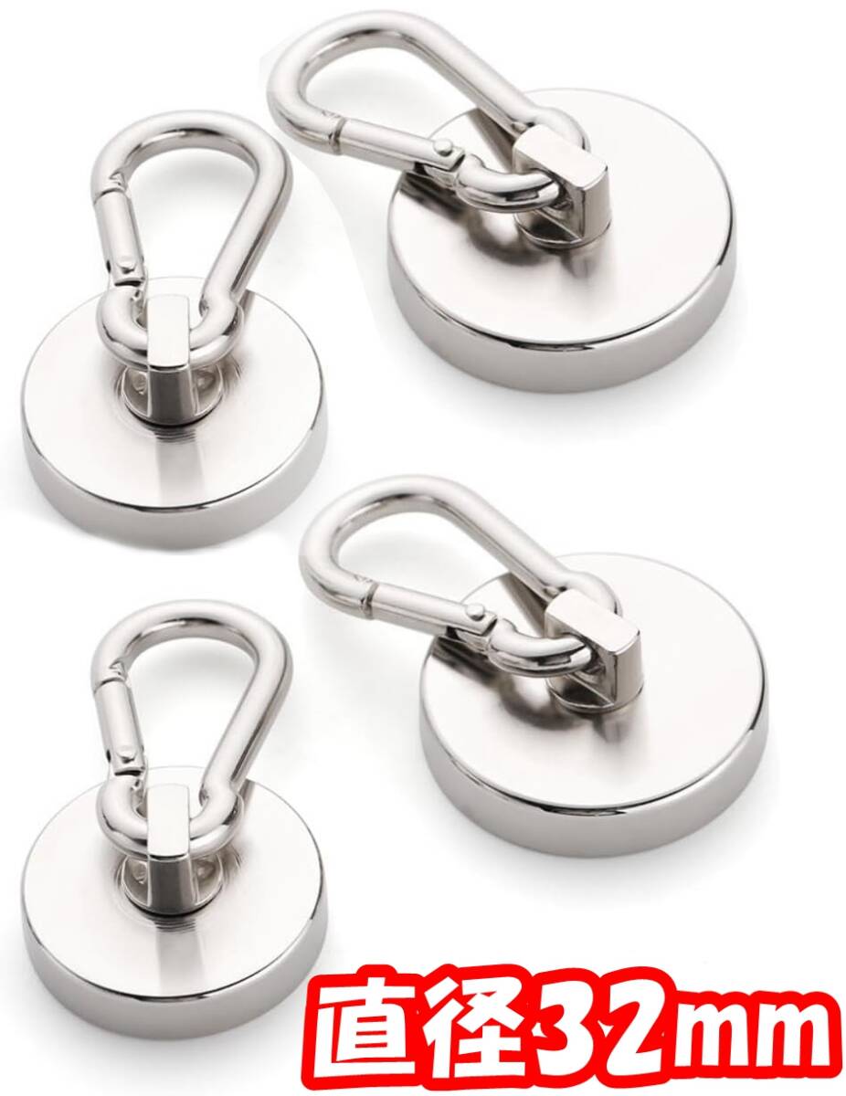 【4個-直径32mm】カラビナ付き磁石 超強力磁石 マグネットフック ネオジム磁石 ステンレス製 防錆
