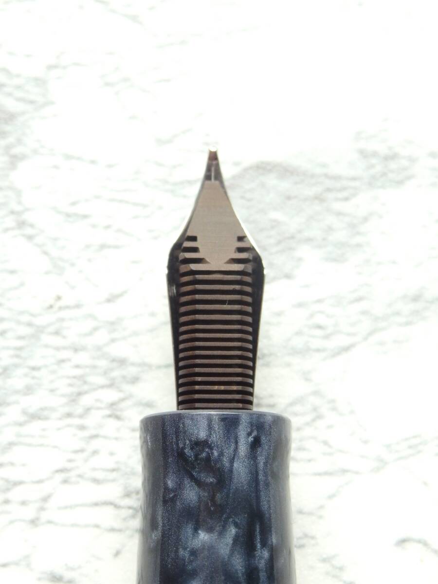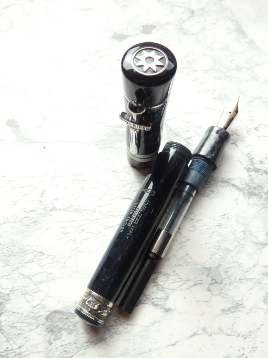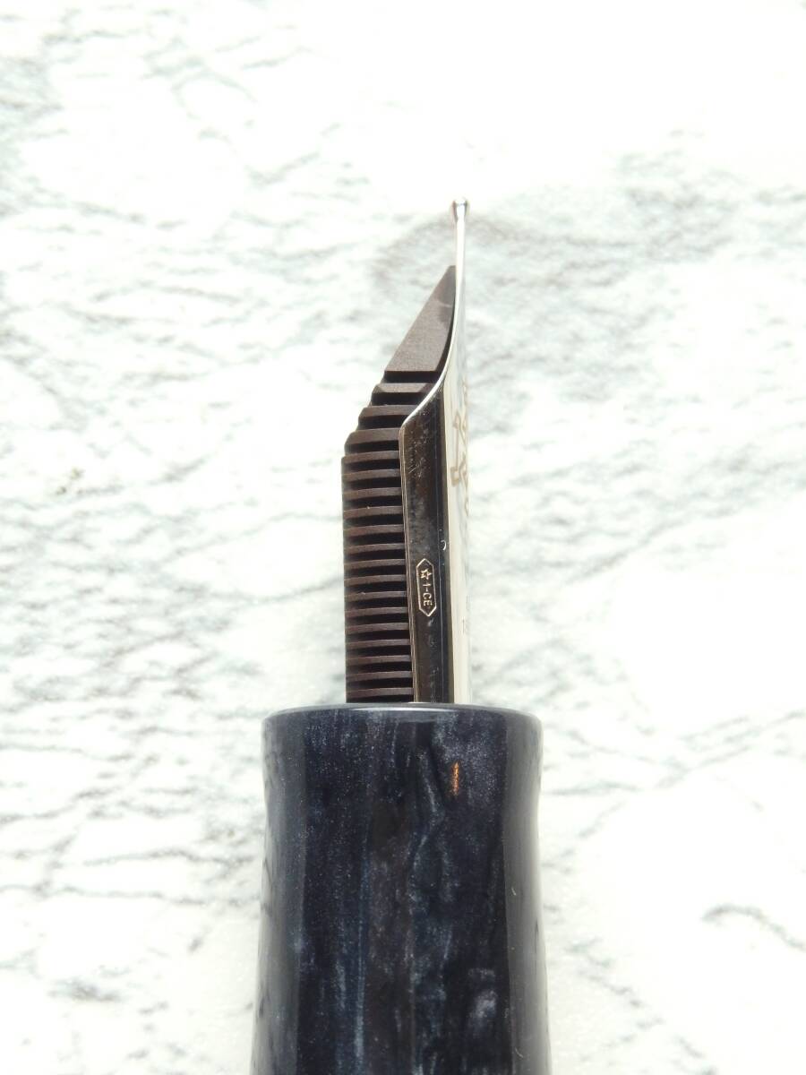 「青の民」と呼ばれる彼等をイメージしたこの万年筆は、グレイブルーのソリッドレジンを削りだして仕上げた深いブルーの軸が印象的です。