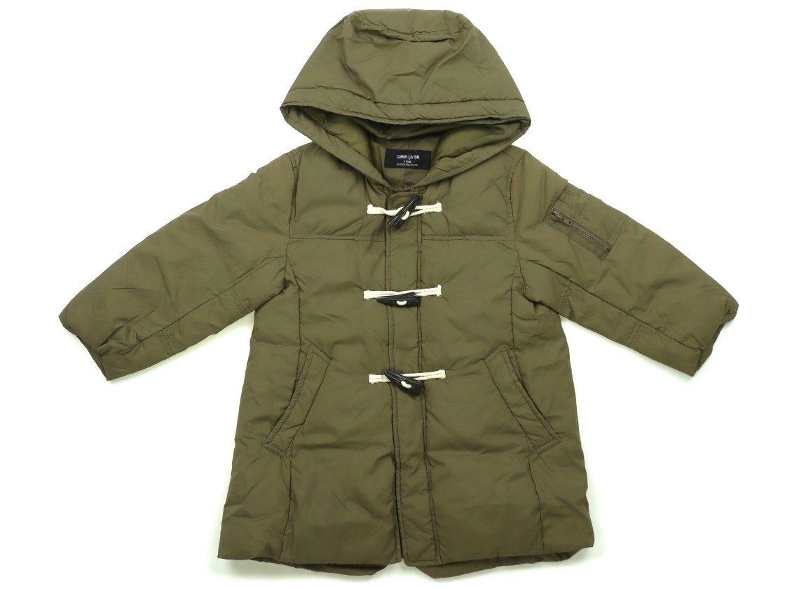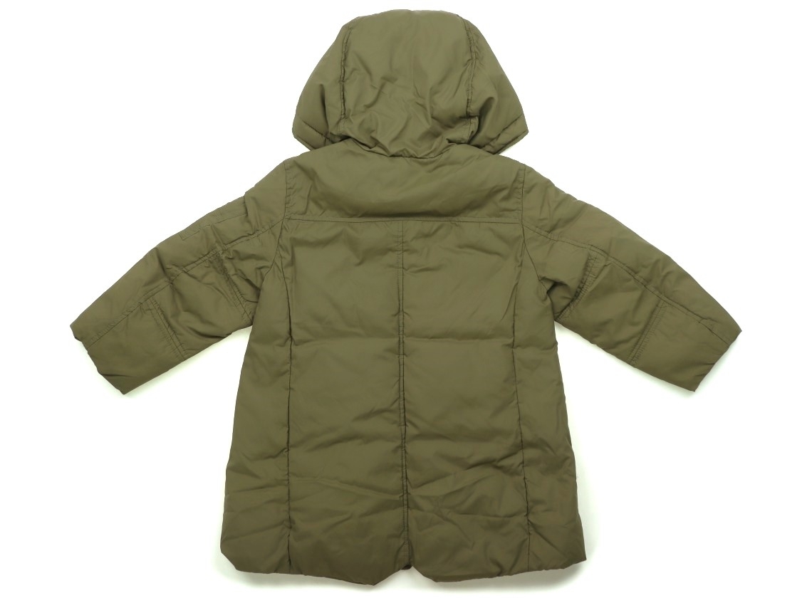 ポリエステル素材。中綿入り。フードは縫い付けです。ファスナー・トグル開き。薄い汚れがいくつか見られます。