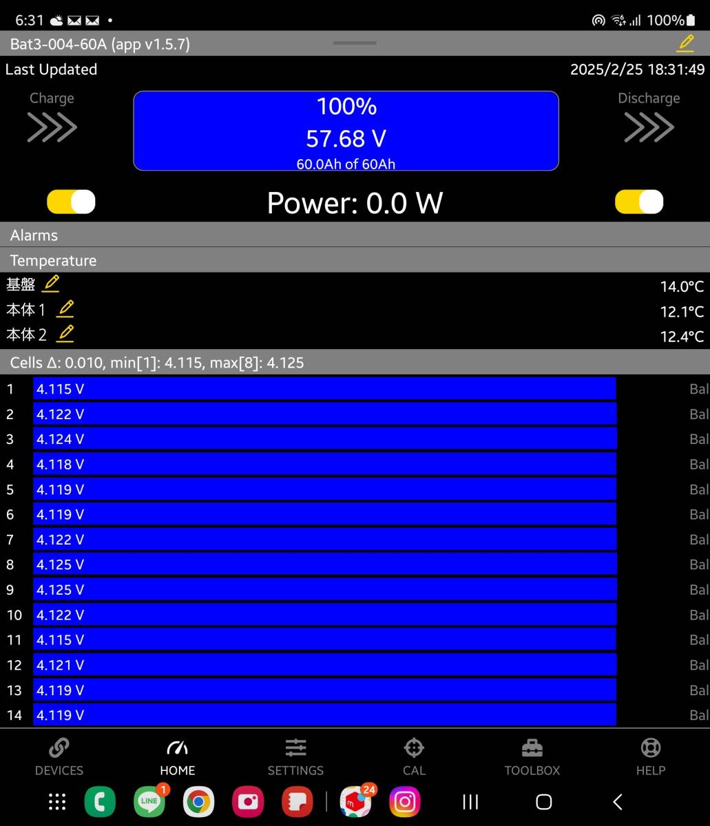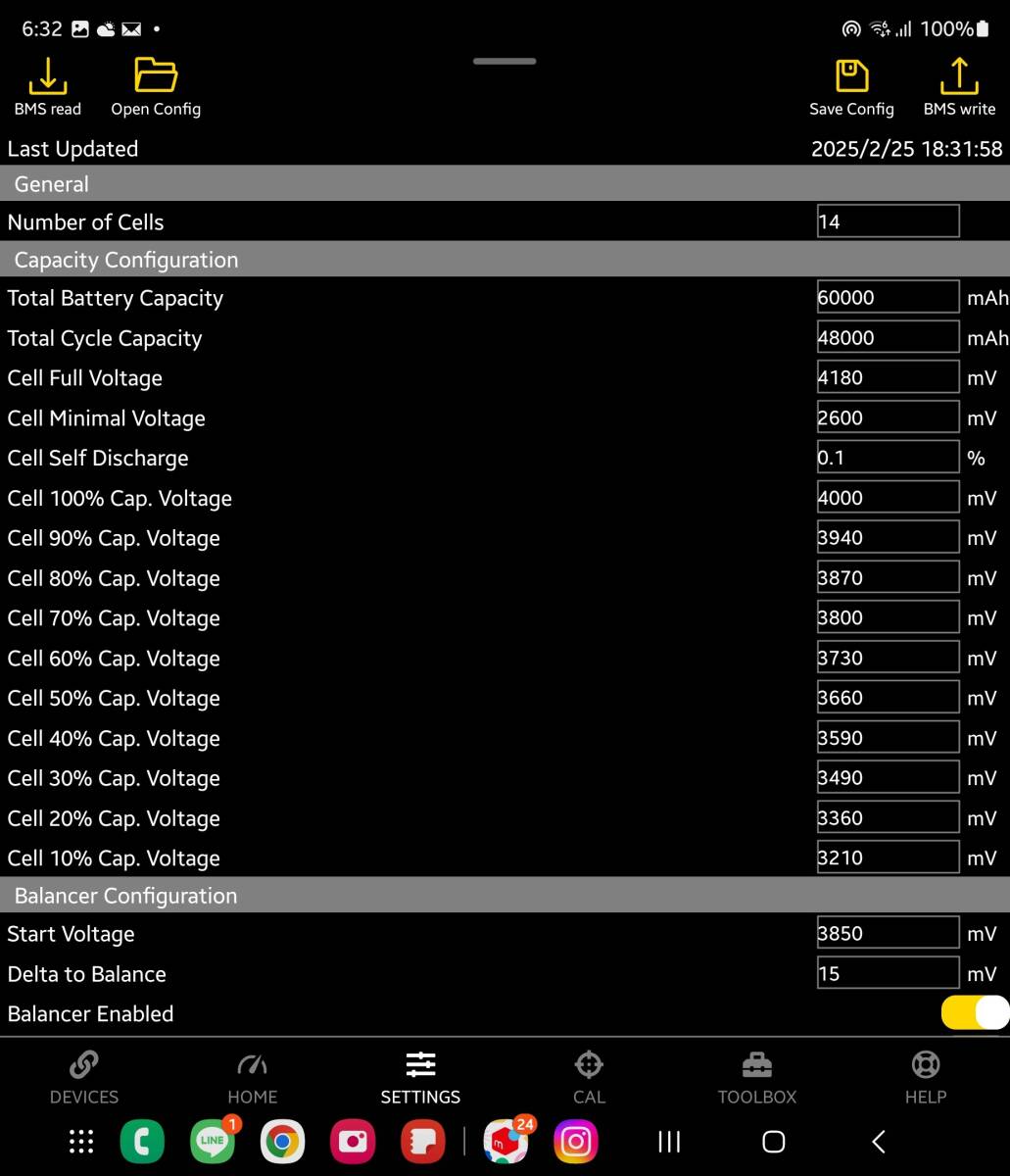不具合があった時は出力はカットされ、スマホで原因を確認ができ、各セルの電圧、セルの最高電圧、最低電圧、気温による放電電圧、充電電圧も設定出来ます。