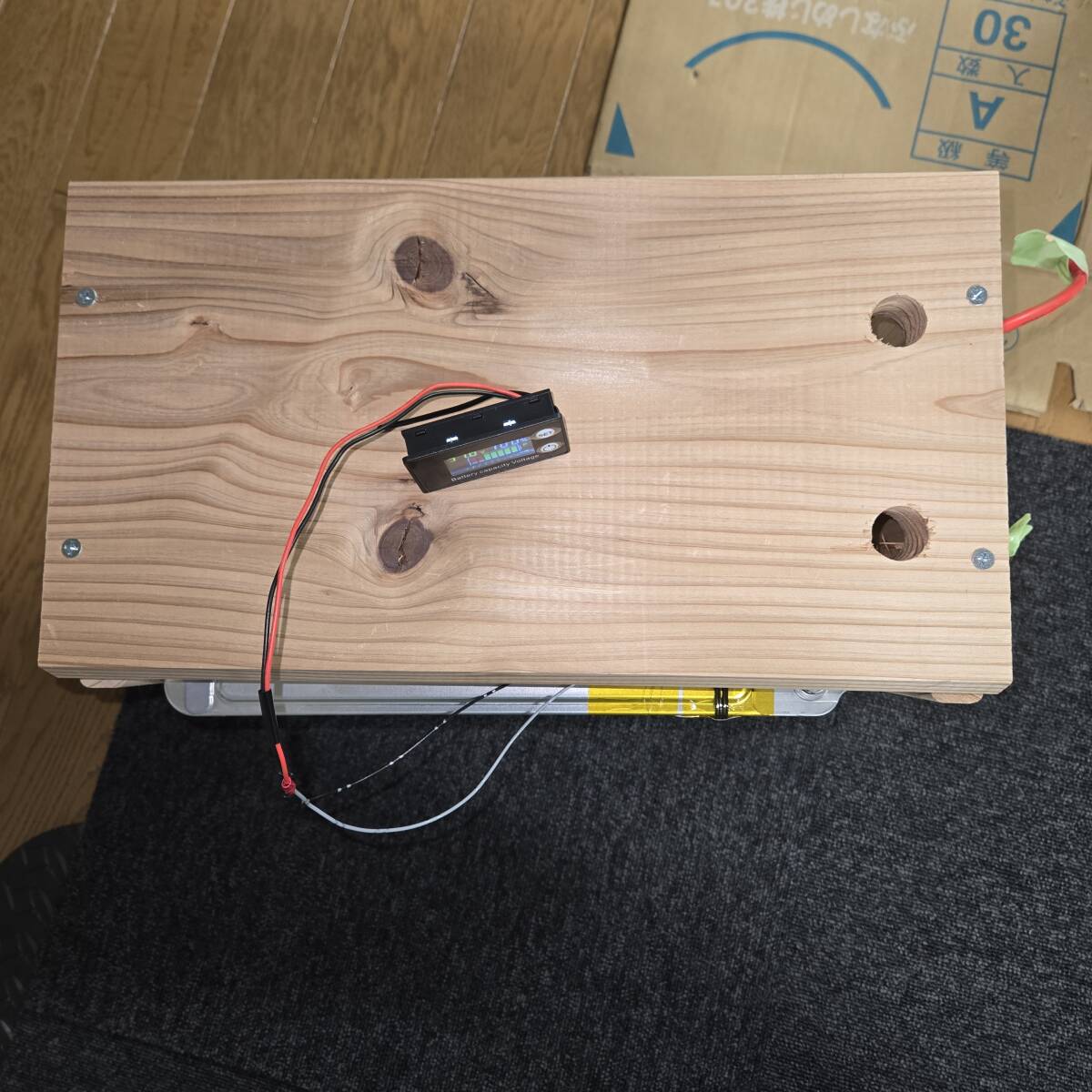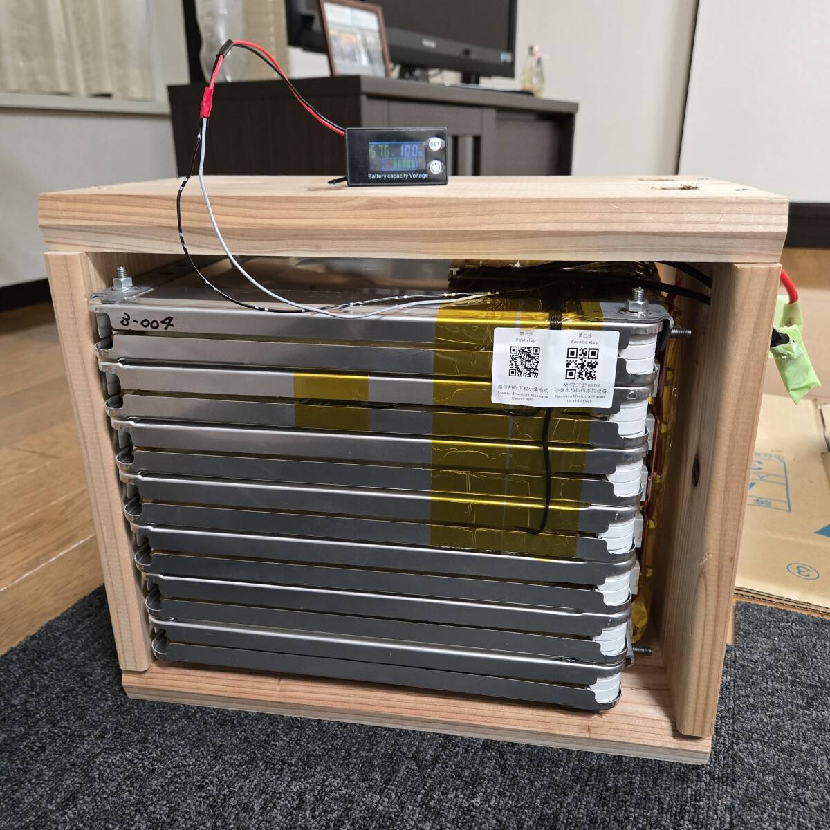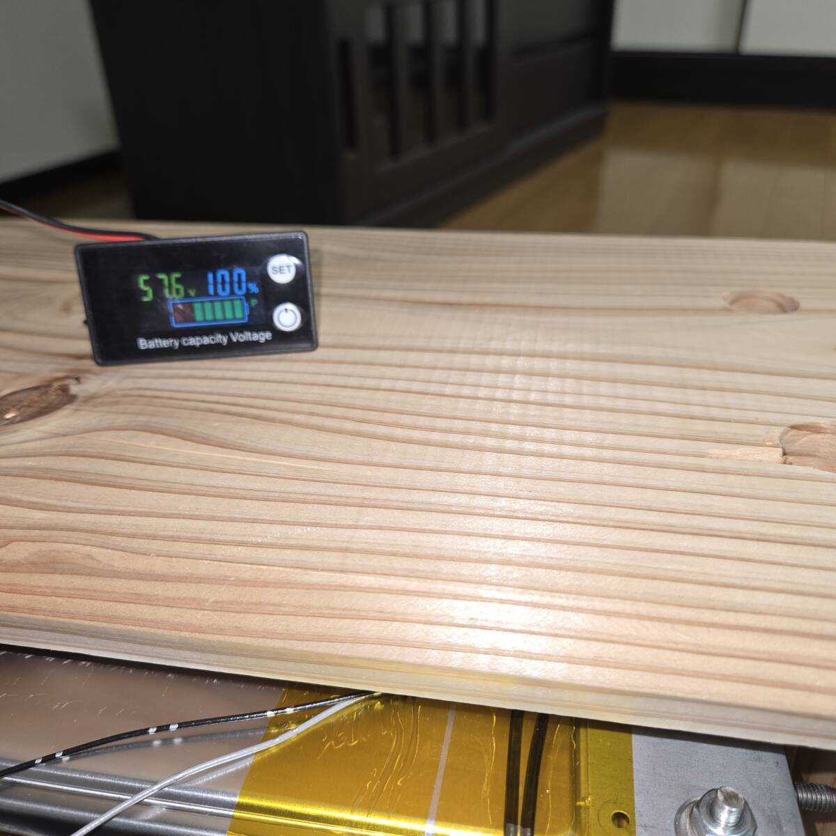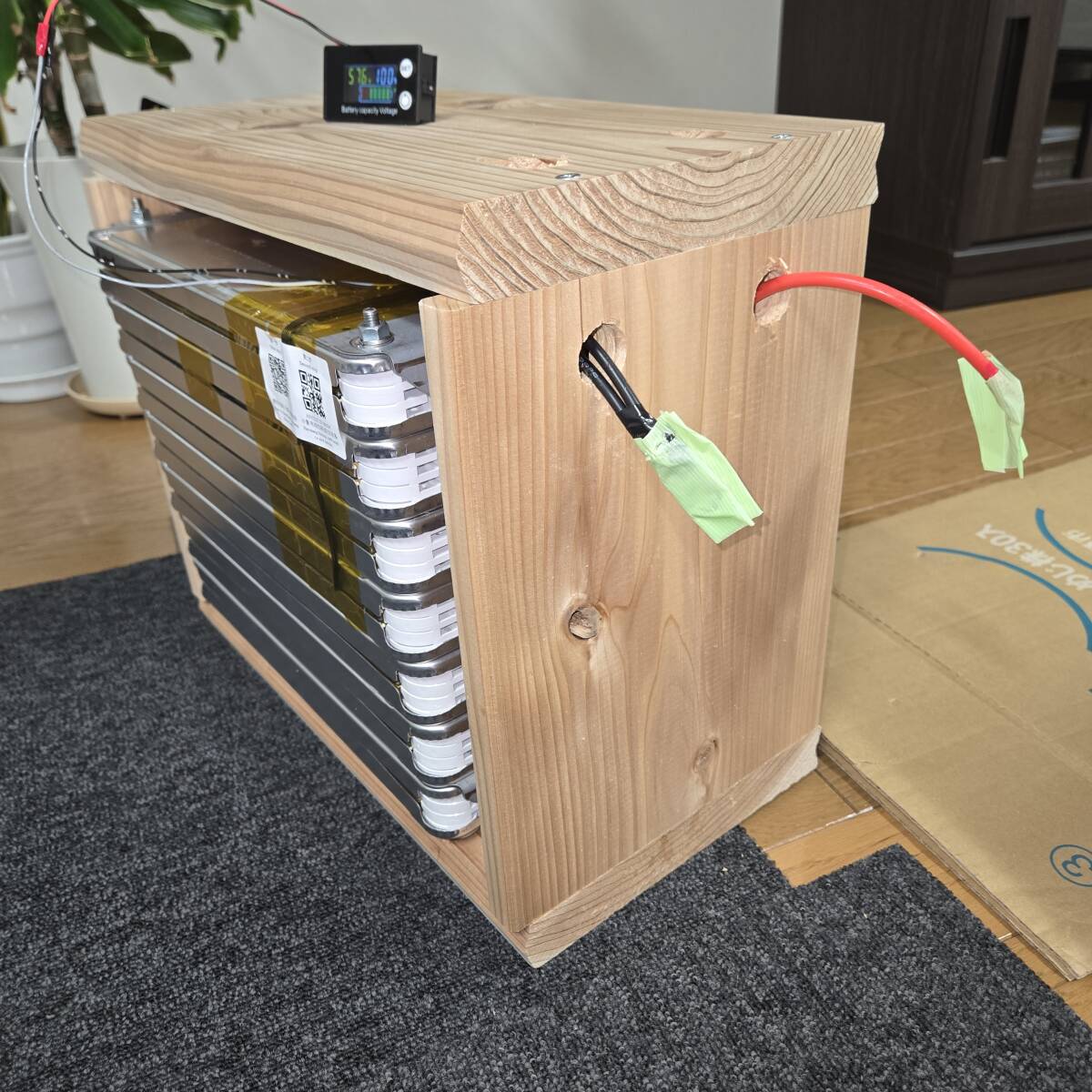 セル単位の細かい電圧はスマホで見ることが出来ますが、さらに電圧計を付け一目で状態を見ることが出来ます。