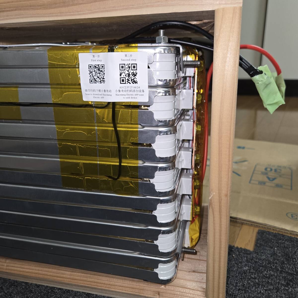 BMSの線は長いままではなく、手間は掛かりますが安全を考慮し、適切な長さに揃え圧着端子等で圧着、もしくは半田できちんと取り付けてテープで保護しています。