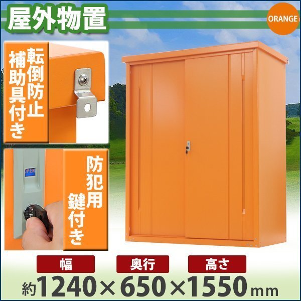 | 商品名 | 送料無料 屋外物置 スチール製 家庭用収納庫 鍵付き オレンジ 幅約1240mm×奥行約650mm×高さ約1550mm UVカット 倉庫 納屋 物置き スチール物置 スチール収納庫 ガレージ 収納 可動棚 吊り戸 吊戸 吊り扉 上吊り 吊引き戸 庭 ガーデン monookishw12d60h15or |