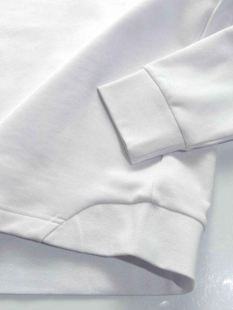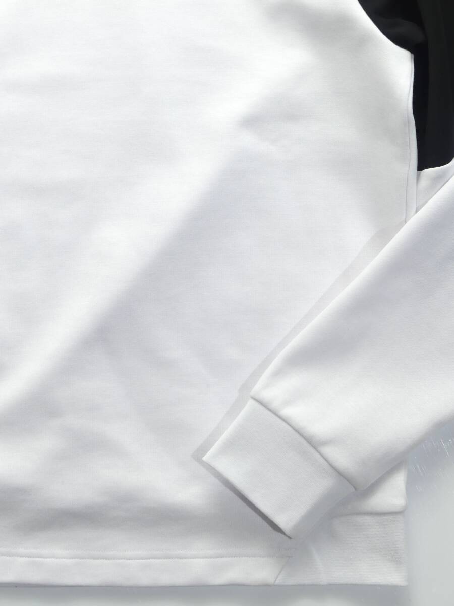 表も裏も同じツルっとした質感のジャージ生地トレーナー。2トーンカラーブロックのカジュアルスポーティー。アスレチック用としてもレジャー用タウン着としても使える万能アスレジャーウェアになります。着てみるとスポーティー感はさほど感じられず、意外とかわいい感じでタウン着としていい感じでした。年齢問わずお勧めできるトップスです。フィット感は好みに個人差がありますが、少したっぷり目に着た方がいい感じに見える服と思います。自分としてはワンサイズもしくは2サイズ上のサイズが見た目が良かったです。季節を問わない通年物ですが真夏には向きませんので実質の秋冬春3シーズン物になります。フィッティングに関してご案内します。試着した感じは出品の欧米Mサイズは日本サイズM相当です。普段他ブランドのイタリア48、日本サイズMをご着用のお客様に、無駄なダボ付きの無い適正フィッティングで快適スタイリッシュにご着用いただけます。チャンピオントレーナーのようなちょうちん型のたっぷりボディーとは異なり、ストレートボディーに近い作りで割とすっきりタイプになりますので、ワンサイズ小さい日本サイズSイタリアサイズ46のお客様にもお勧めできるサイズです。気持ちたっぷり目でタウン着にお勧め着こなしになります。