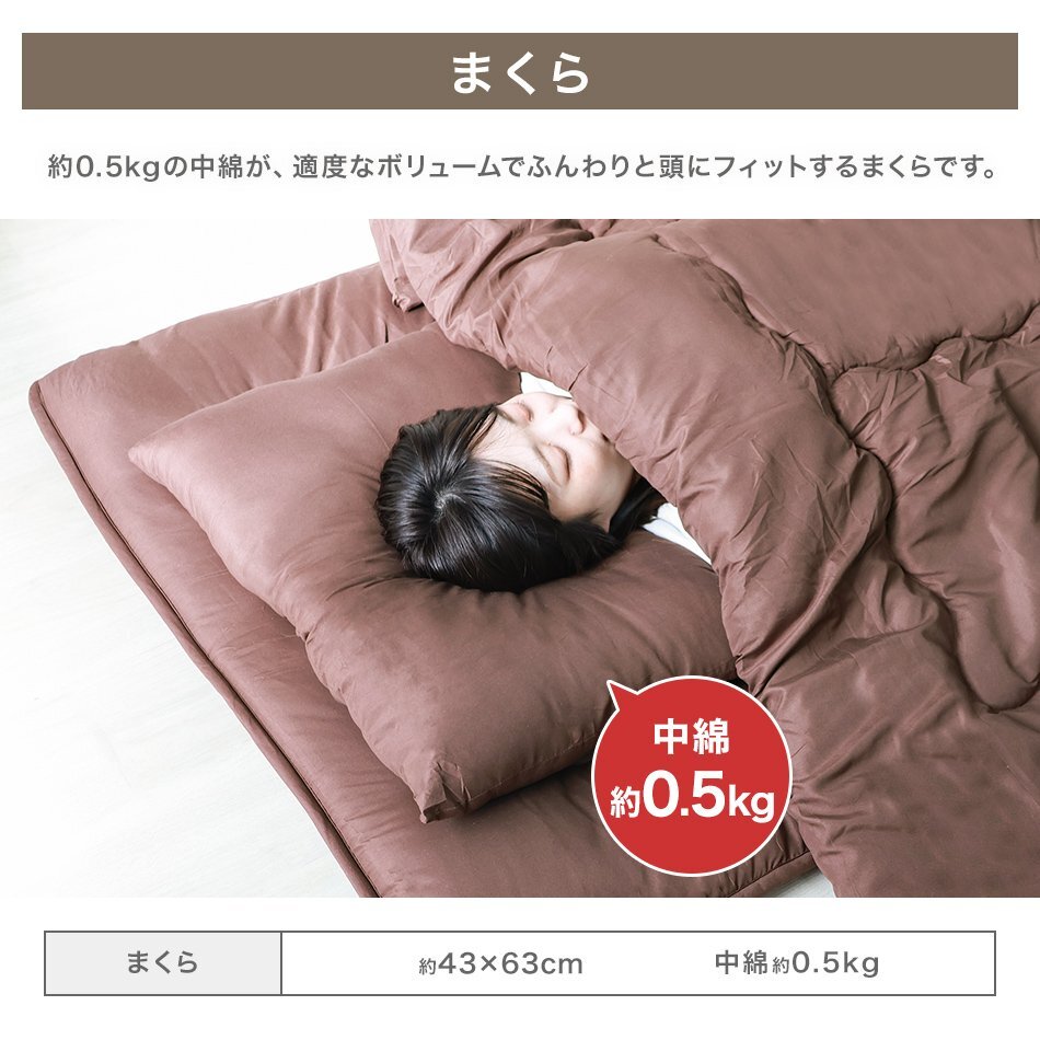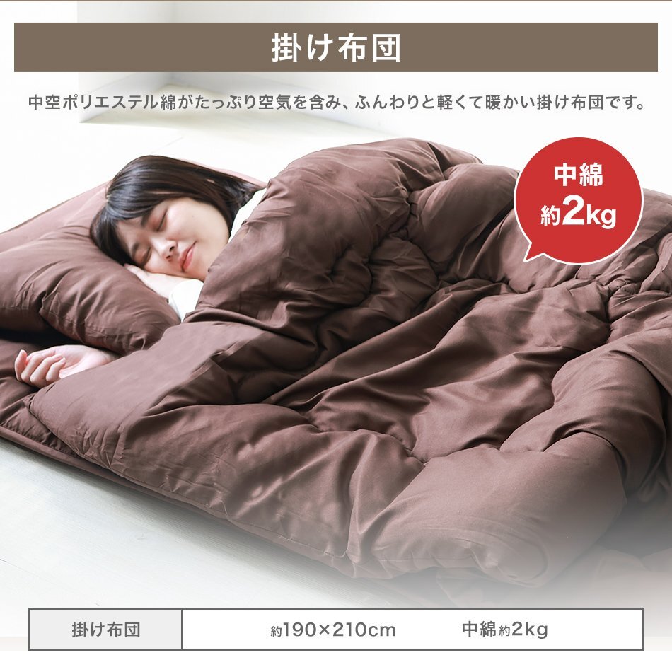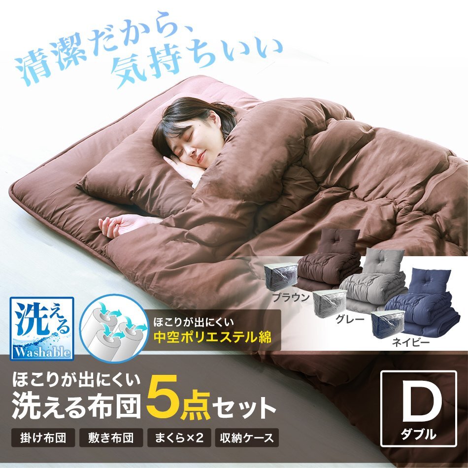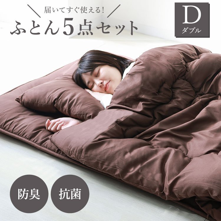届いてすぐ使える寝具4点+収納ケースの5点セットです。 中綿には抗菌・防臭効果のある衛生的な中空ポリエステル綿を使用! 耐摩擦・耐久性に優れ、ホコリが出にくく睡眠の妨げとなるムズムズ感を軽減します。 アレルギーのある方や敏感肌の方におすすめです♪ 底付き感を感じないボリュームで、快適な寝心地とふんわり優しく包みこまれる気持ちよさを実現! また、抗菌防臭加工が施されており、いつでも清潔に使えます。 \すぐ使えるから、こんな方におススメ♪/ ・一人暮らしや新生活を始める方 ・新生活を始める方 ・来客者用の布団一式を考える方 ・布団、寝具の買い替えを考える方 ・社員寮など業務用として考える方 【商品内容】 掛け布団、敷き布団、まくら、収納ケース 【商品詳細】 カラー:ブラウン サイズ:ダブル :掛け布団 (約)190cm x 210cm :敷き布団 (約)140cm x 210cm :まくら (約)63cm x 43cm 素材:ポリエステル (寝具セット ふとんセット カバーセット ふとんカバー 布団 おしゃれ 人気 おすすめ WEIMALL) |