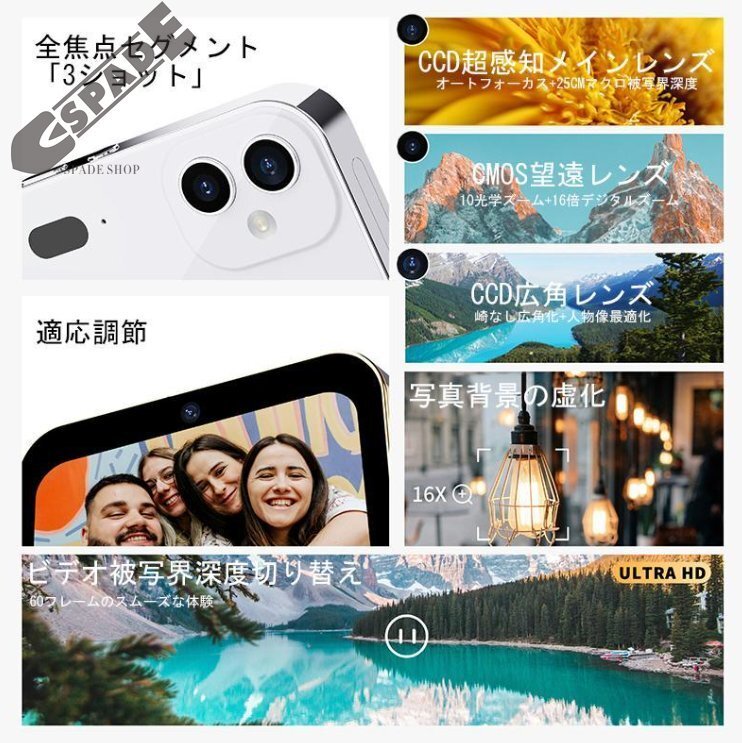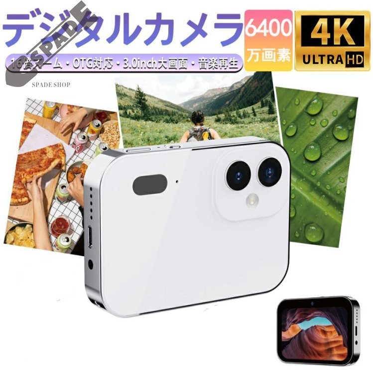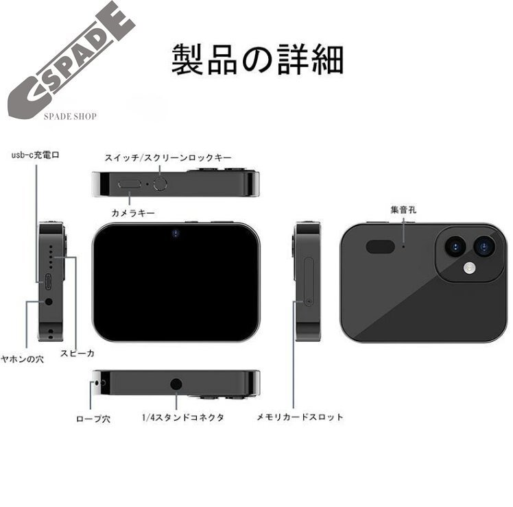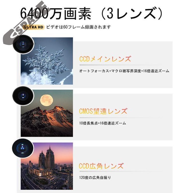 | 商品情報 | 基本特徴 三つのレンズ(オートフォーカス、望遠、広角) 4K録画解像度MAX 6400万画素MAX 亜鉛合金フレーム、ガラス製裏蓋 3600mAhバッテリー(内蔵リチウム電池) 機能のハイライト:映画鑑賞、音楽再生、イヤホン接続、アラーム設定、フィルター変更、音声録音、写真撮影、ビデオ撮影、ウェブカメラ 3インチタッチスクリーン(480x854解像度)、ビデオ形式AVI、高さ360、幅640 画像解像度:64MP、56MP、48M(8000 × 6000)、36M(6880 × 5160)、24M(5600 × 4200)、20M(5120 × 3840)、16M(4640 × 3480)、12M(4032 × 3024)、8M(3264 × 2448)、5M(2592 × 1944) ビデオ解像度:4K 30FPS、2.7K/1080P 60FPS、1080P 30FPS、720P 60FPS、720P 30FPS 拡張メモリ(TFカード):最大128Gまで拡張可能 バッテリー駆動時間:低照度で約2時間、通常使用で1~2日 ファイル形式:写真JPEG、ビデオAVI 撮影距離:2.95mmから無限遠1キロ以上 インターフェース:充電ポートType-C、イヤホンジャック3.5mm シャッタースピード:1/10秒~1/2650秒 |